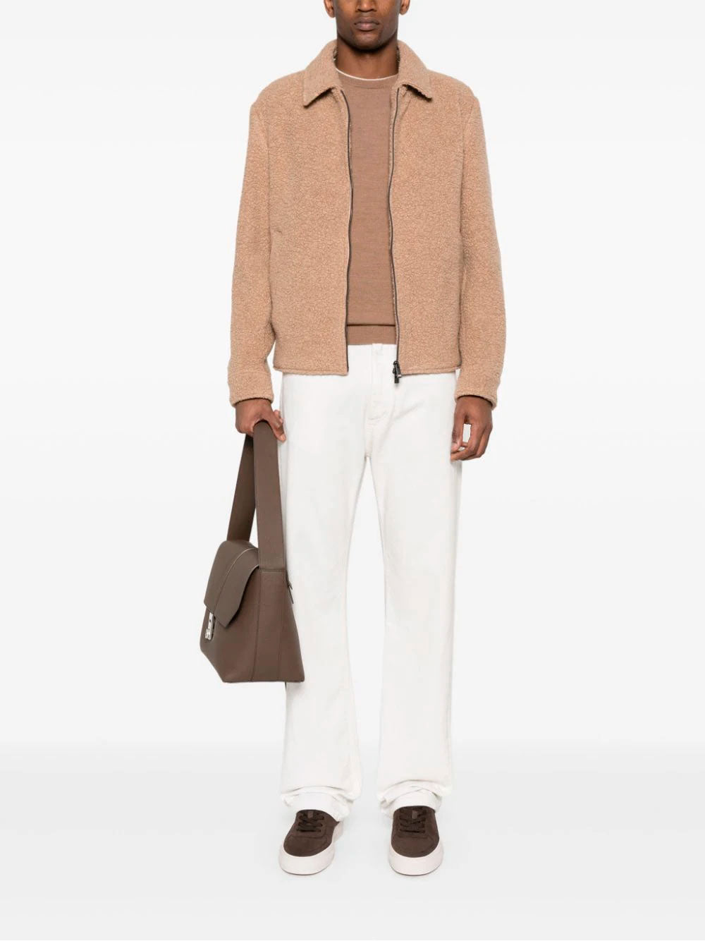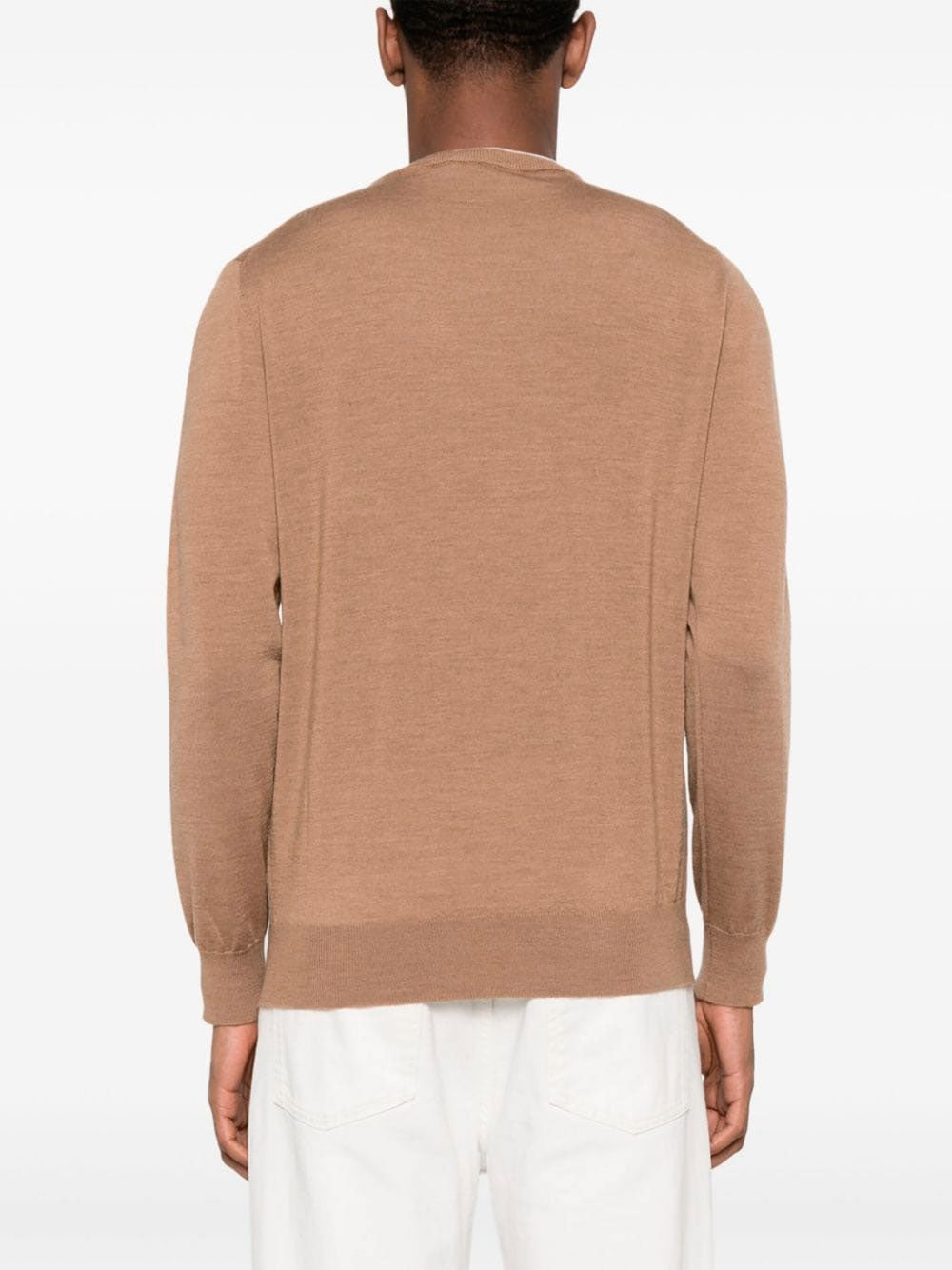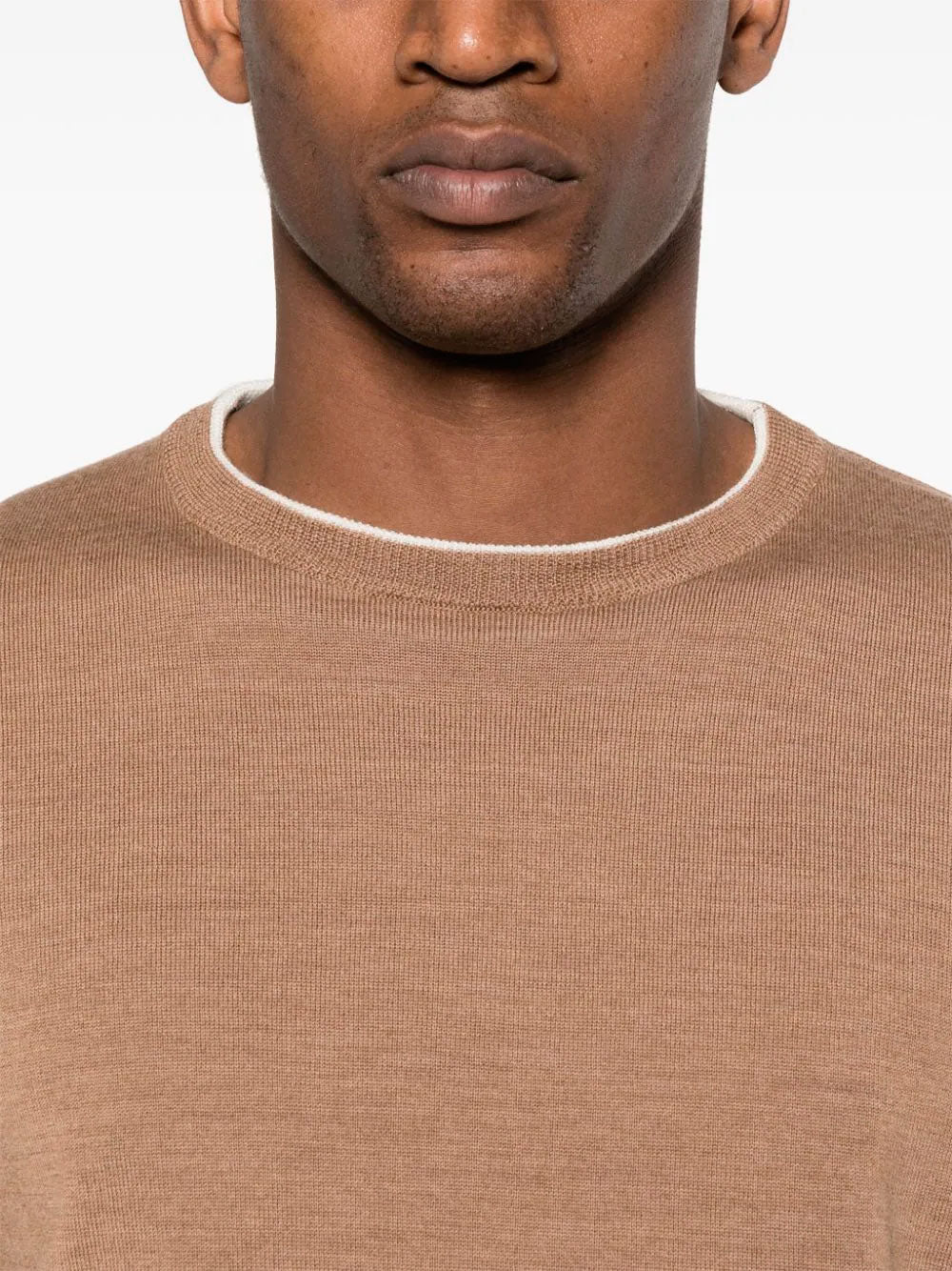 Canali camel brown merino wool jumper. Finely knit, featuring a ribbed neck with a striped border, long sleeves and ribbed cuffs and hem.