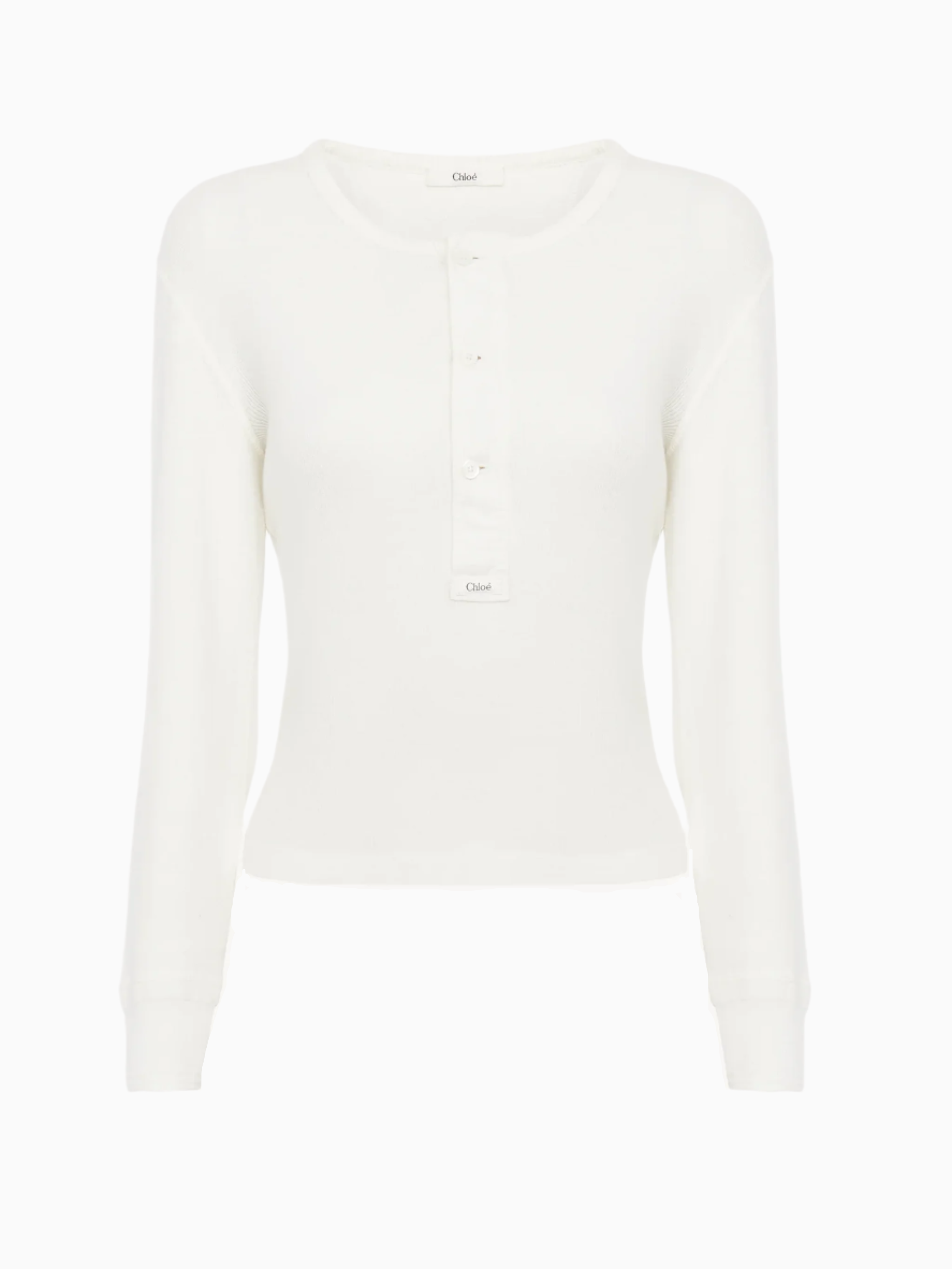 Chloé Henley t-shirt. Crafted in white flatlock ribbed cotton jersey with mother-of-pearl buttons, tonal Chloé logo embroidery at the back of the neck and a Chloé logo patch at the base of the button placket. Featuring long sleeves and a straight fit.