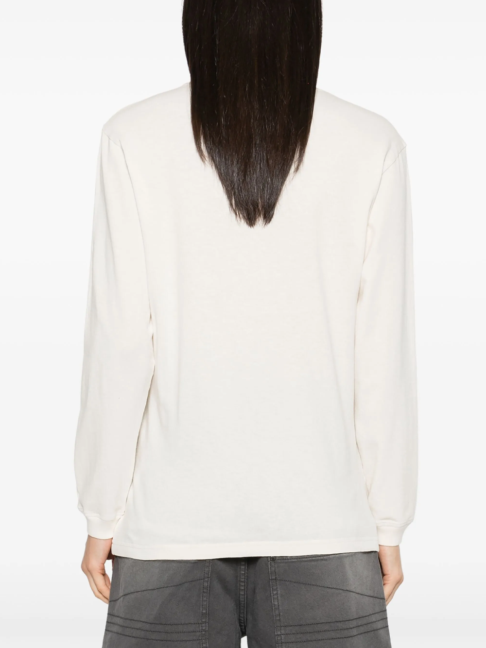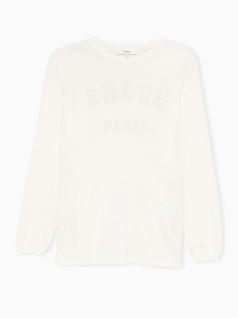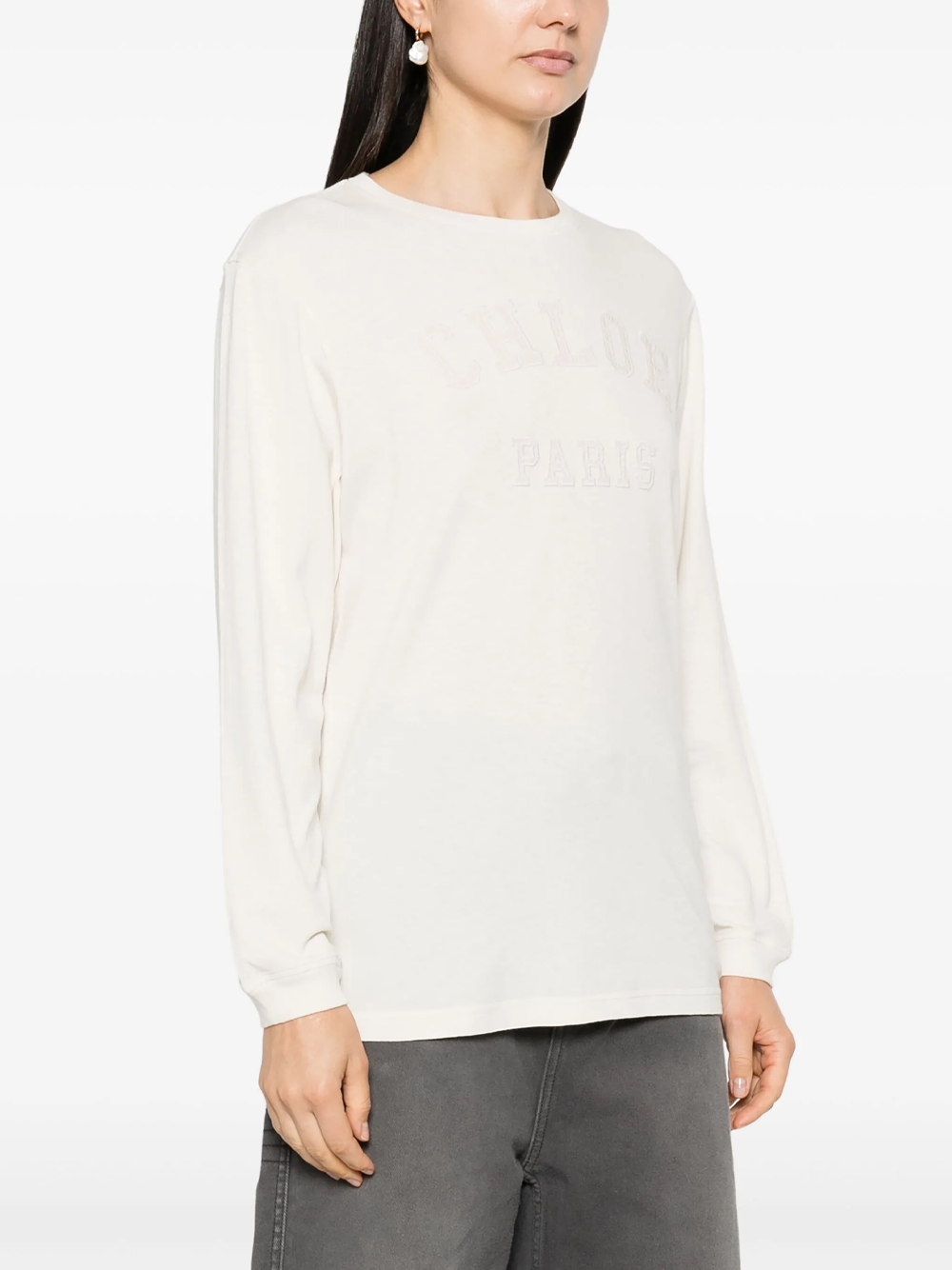 Chloé long-sleeve t-shirt in white cotton. Crafted in organic cotton jersey with long sleeves and an oversized fit. Featuring a tonal, textured Chloé Paris logo.