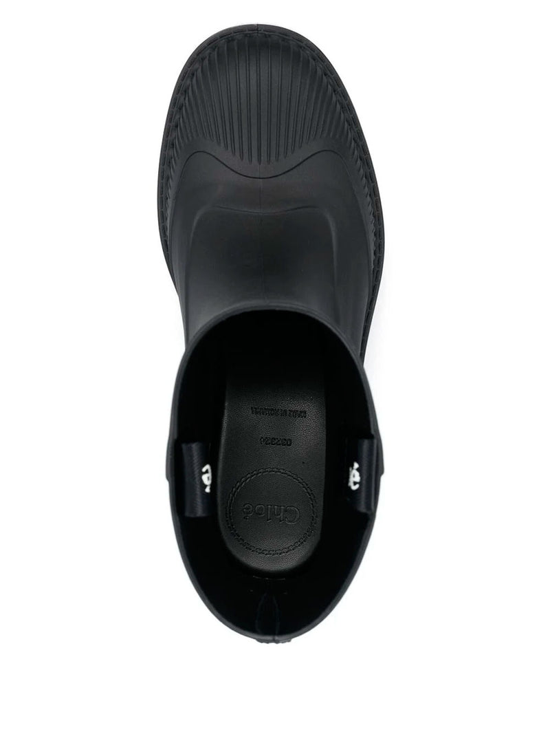 Chloé black rubber ankle boots, ornamented with embossed logo to the rear and double pull-tab at the opening with the brand name. The round toe design presents, branded insole, 55mm block heel, ridged rubber sole and slip-on style.