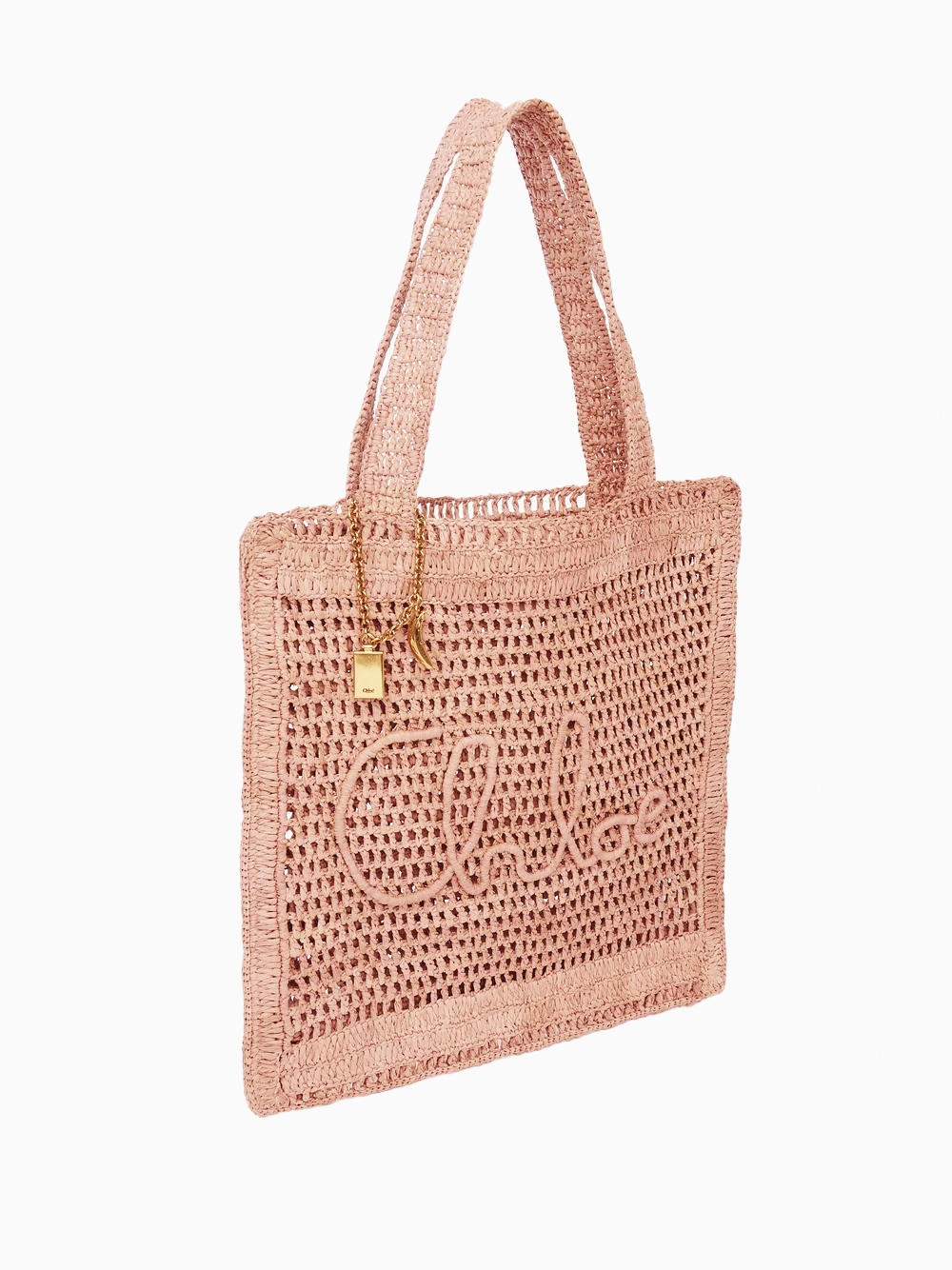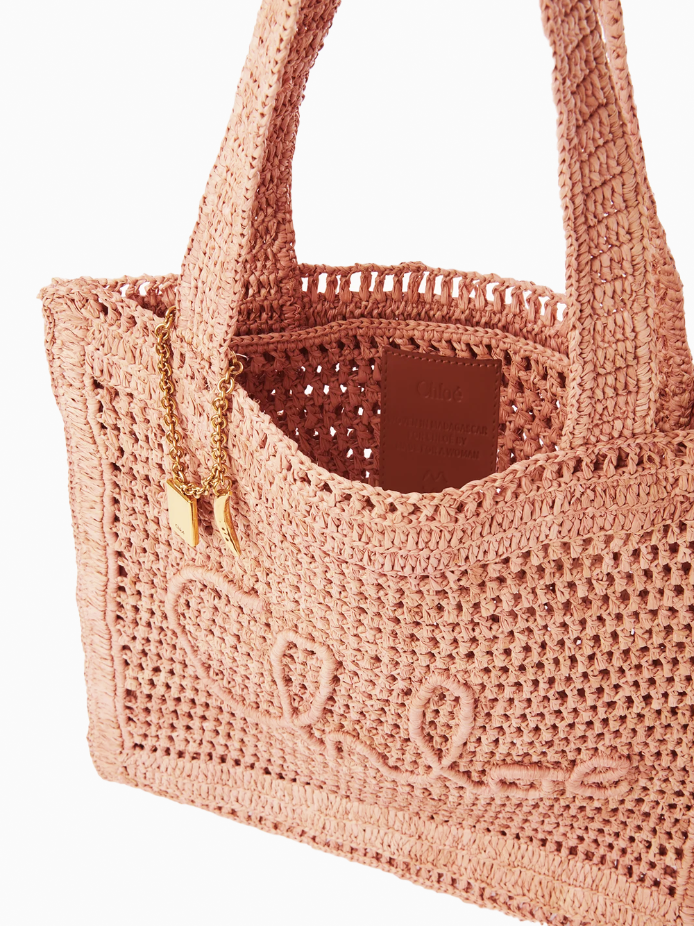 The Summer Banana tote bag by Chloé has been crafted in raffia by a single artisan over 4.5 days in collaboration with Made For A Woman. The front features a handwritten signature inspired by Chloé's heritage. It features a dangling chain and charms, two main compartments and a magnetic closure.