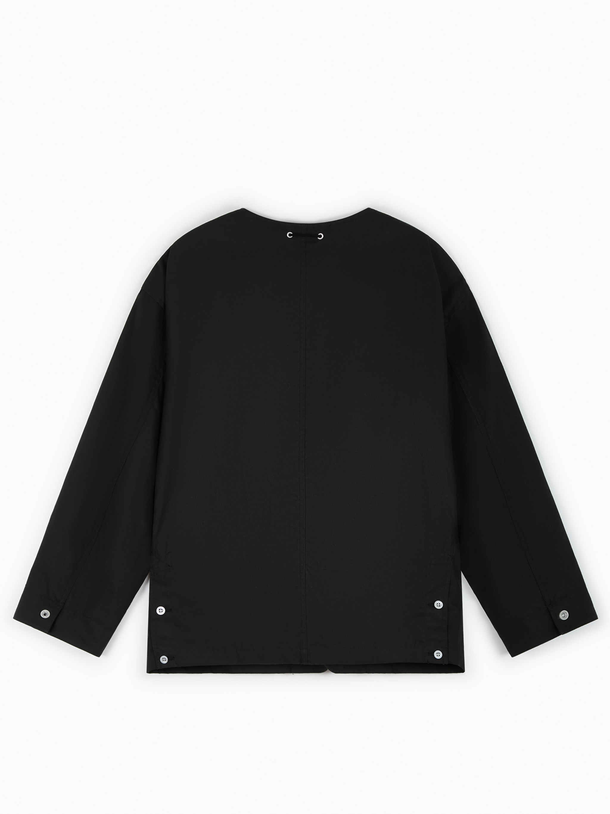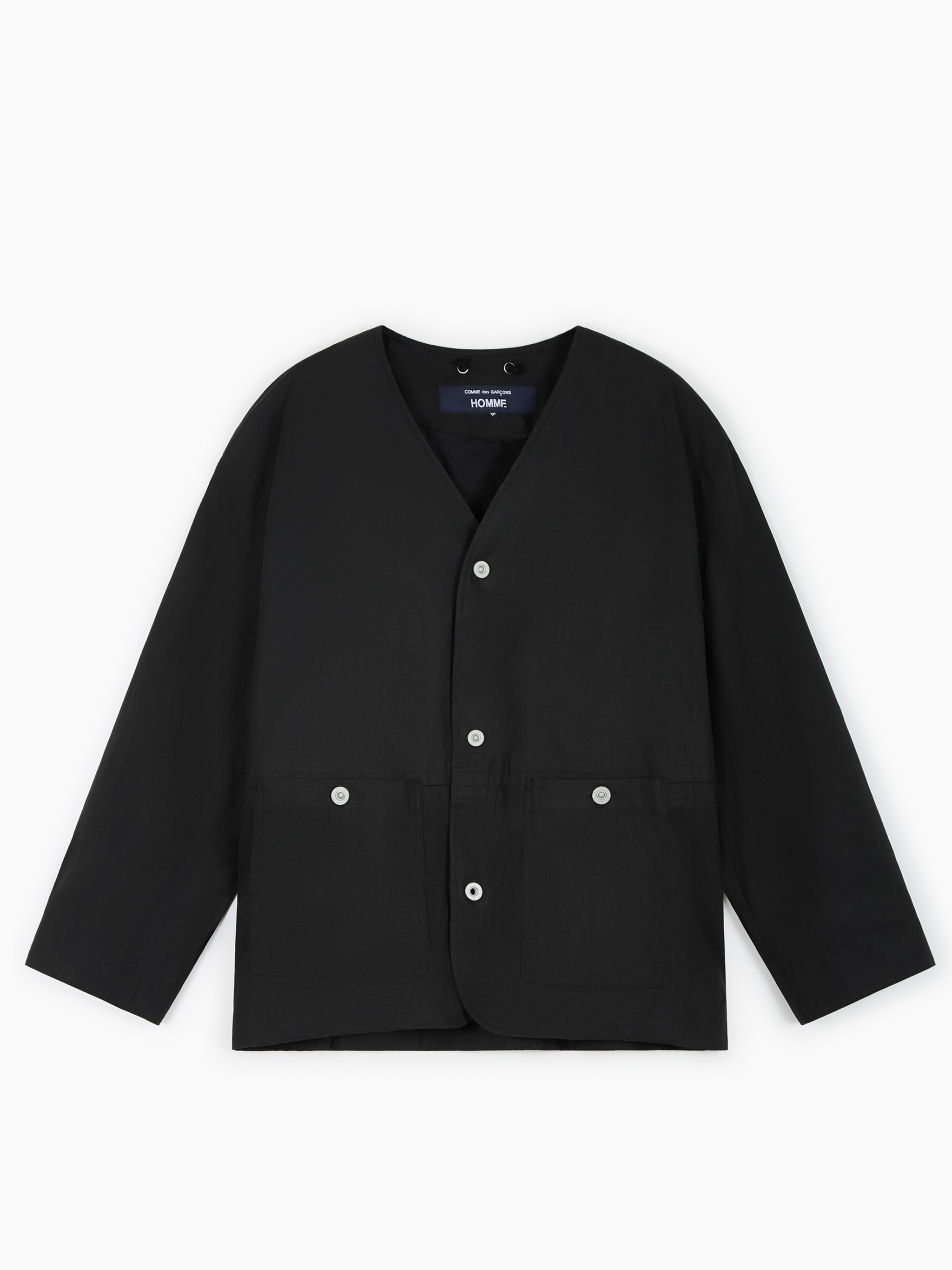 Comme des Garçons Homme collarless jacket. Crafted in black cotton and linen blend with two front pockets, press-button fastening on the front an a modern, minimalist japanese design.