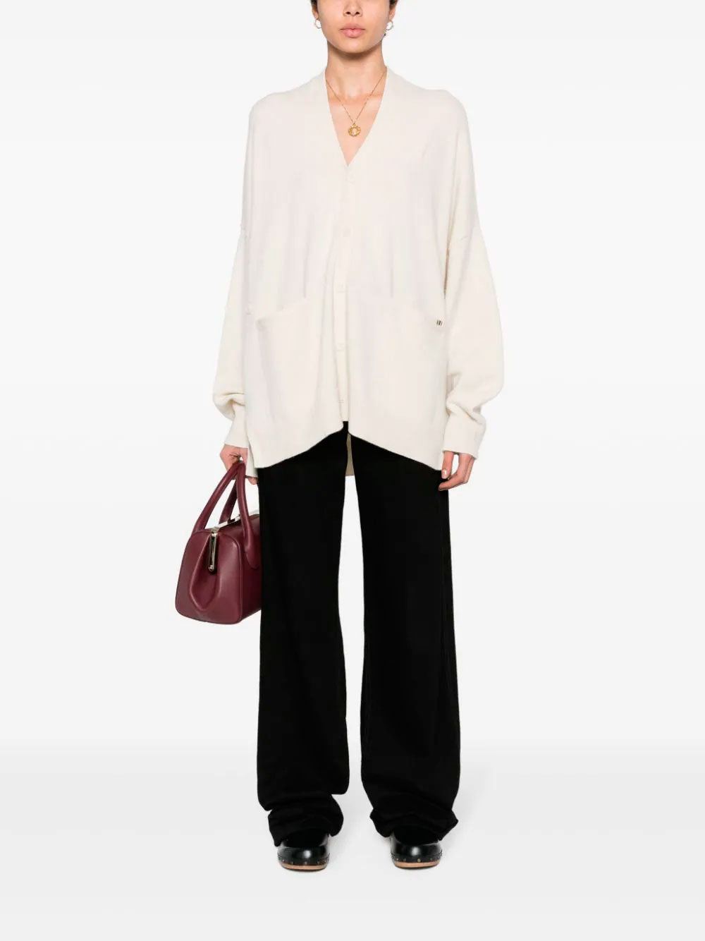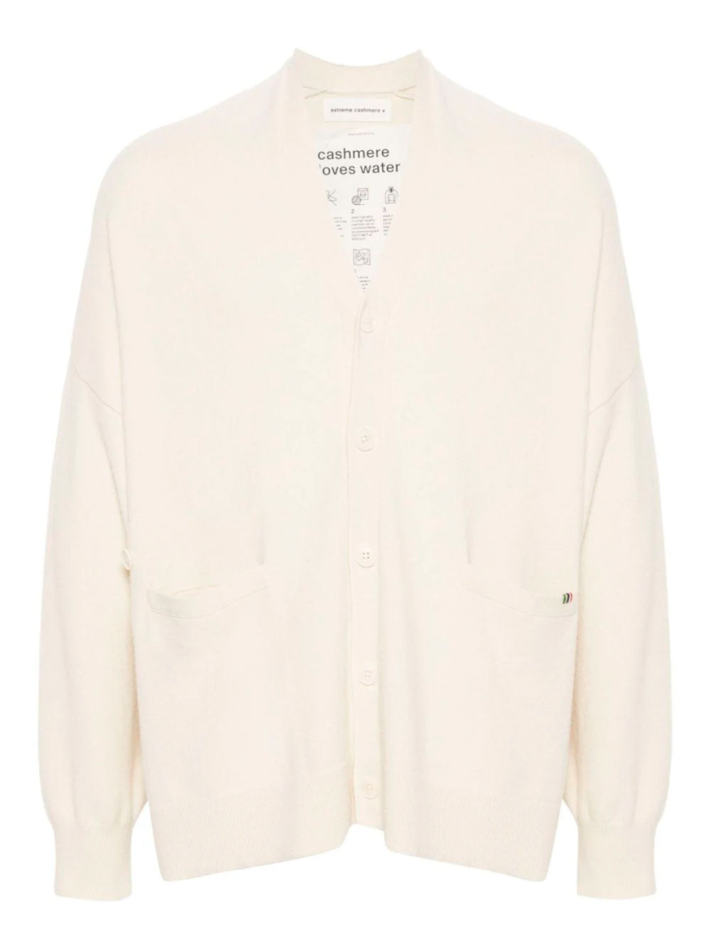 Extreme cashmere´s N°24 Tokio cardi-coat, crafted in ivory white cashmere blend. Featuring fisherman's knit, V-neck, drop shoulder, long sleeves and ribbed cuffs. Two front patch pockets, unlined, ribbed hem and front button fastening.