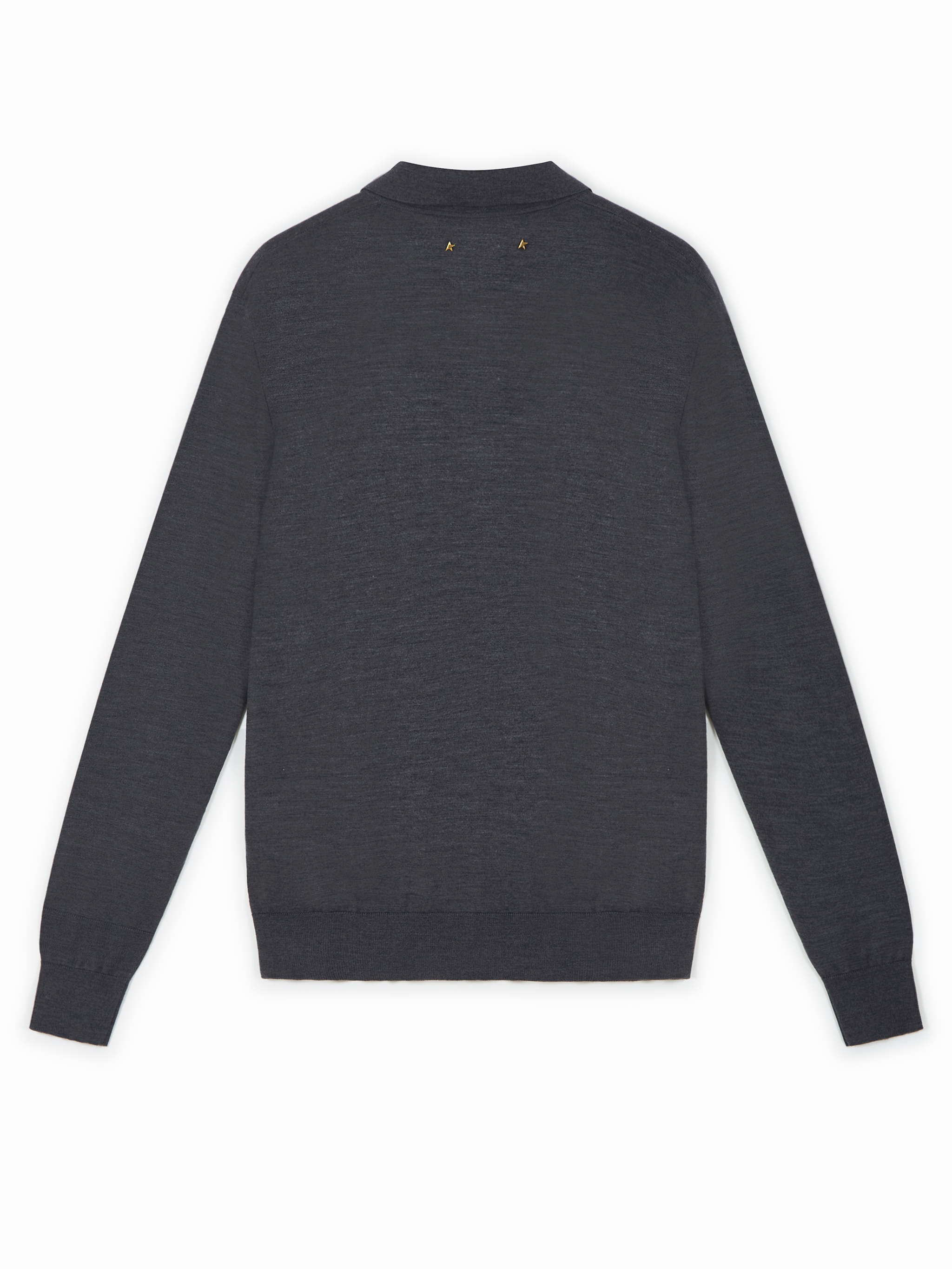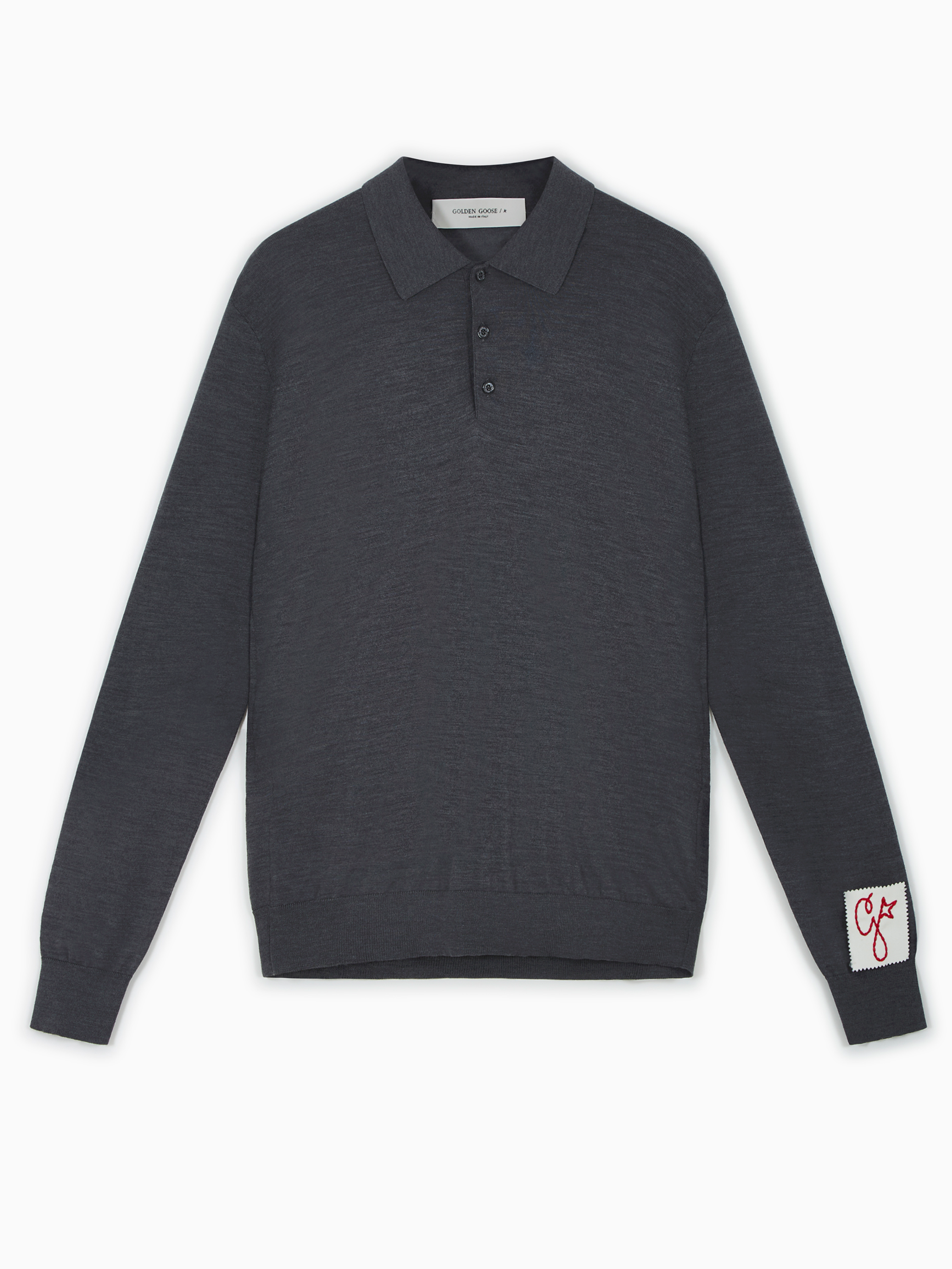 Golden Goose grey jumper in virgin wool with polo shirt neckline and decorated at the left sleeve with recognisable logo patch. The jumper features ribbed cuff and hem and three button fastening at the neck.