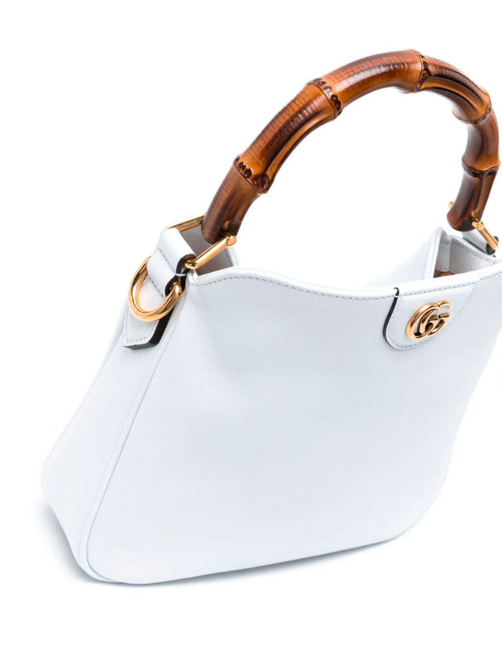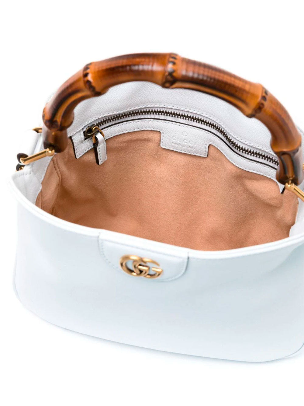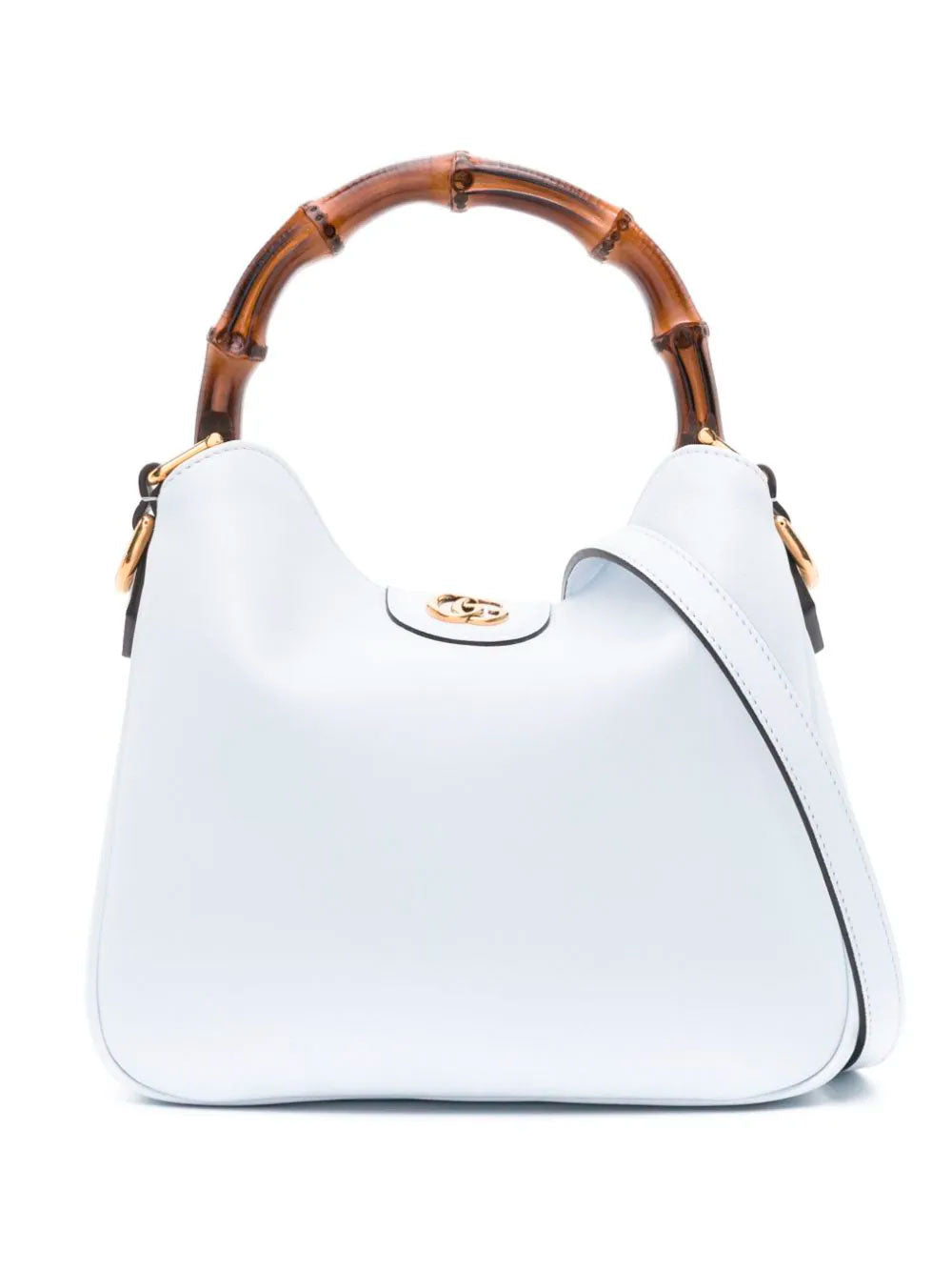 Gucci´s Small Diana leather tote bag, crafted in light blue leather. Featuring signature bamboo top handle, two adjustable detachable shoulder straps and signature Interlocking G logo plaque. Main compartment, debossed internal logo, internal zip-fastening pocket, suede lining and foldover top with magnetic fastening.