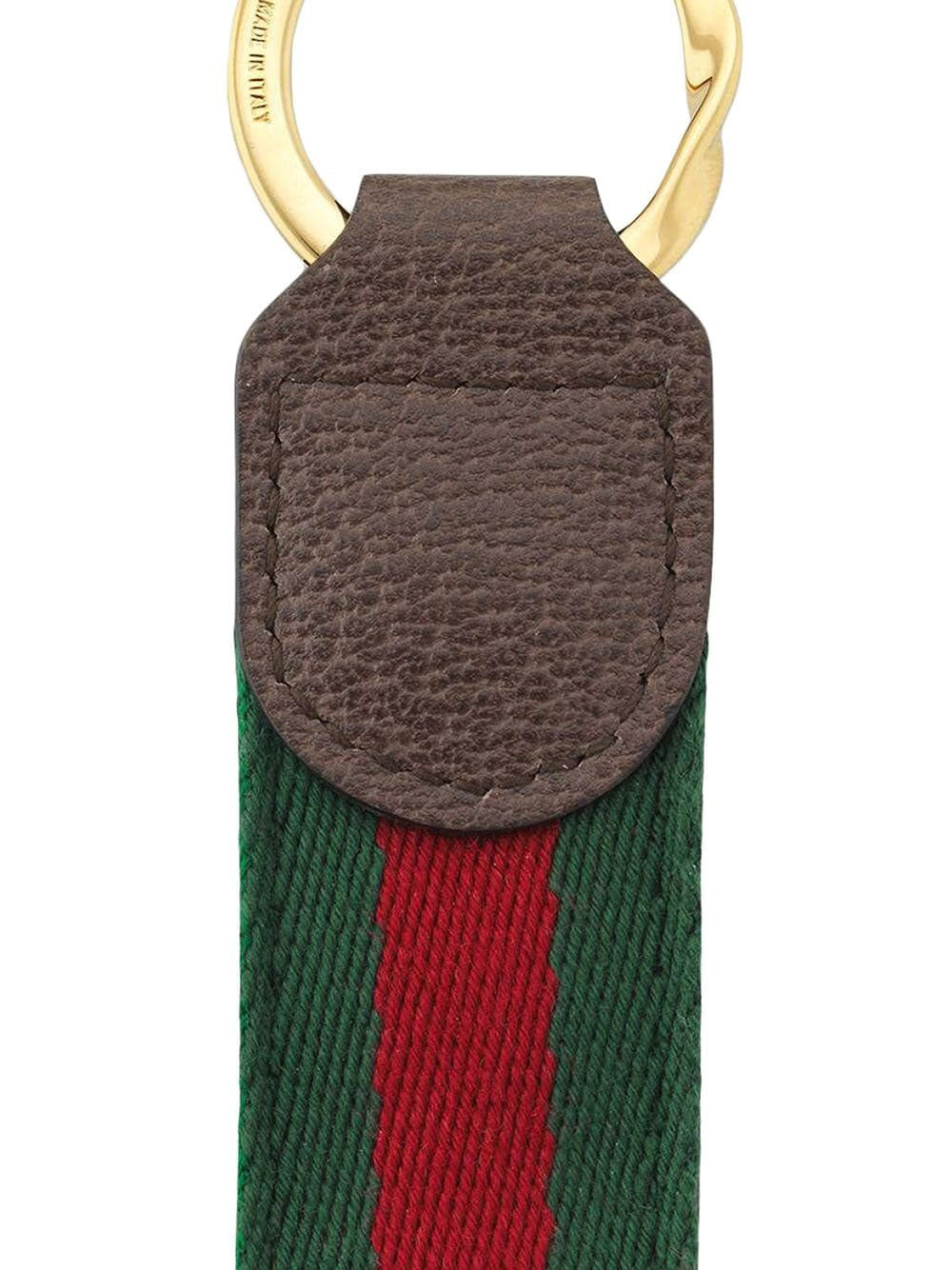 Gucci Ophidia keychain with a green and red Web stripe and brown leather trim. Gold-toned Double G hardware.