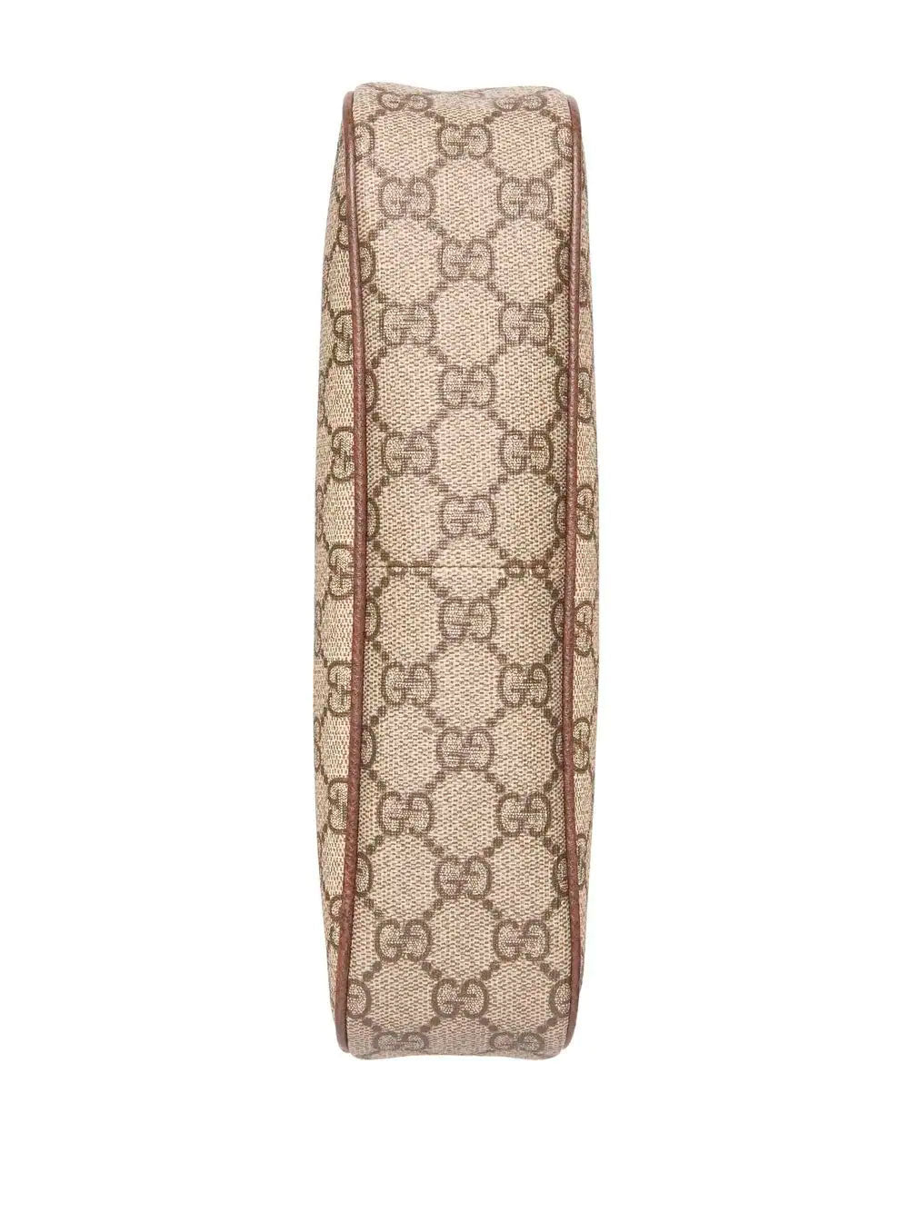 Gucci beige and brown leather bag. Featuring GG Supreme canvas, leather trim, signature Double G logo, strawberry motif charm, detachable chain-link top handle, signature Web shoulder strap, top zip fastening, main compartment, internal slip pocket and gold-tone hardware.
