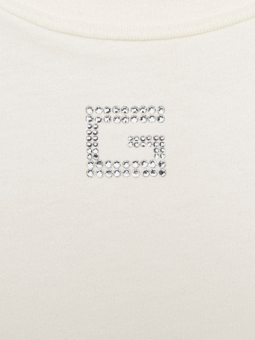 Gucci´s square G crystal embellished T-shirt in white cotton. Featuring jersey knit, crew neck, short sleeves, ribbed trim, straight hem and cropped.