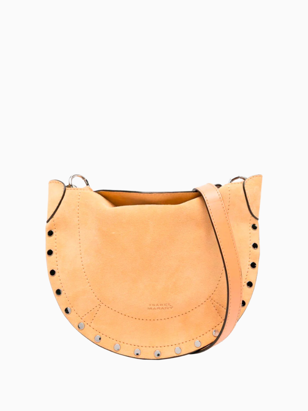 Isabel Marant toffee leather bag. Crafted in suede, silver-tone stud detailing, debossed logo to the front and debossed internal logo. Featuring silver-tone hardware, concealed magnetic fastening and adjustable shoulder strap. Main compartment and full lining.