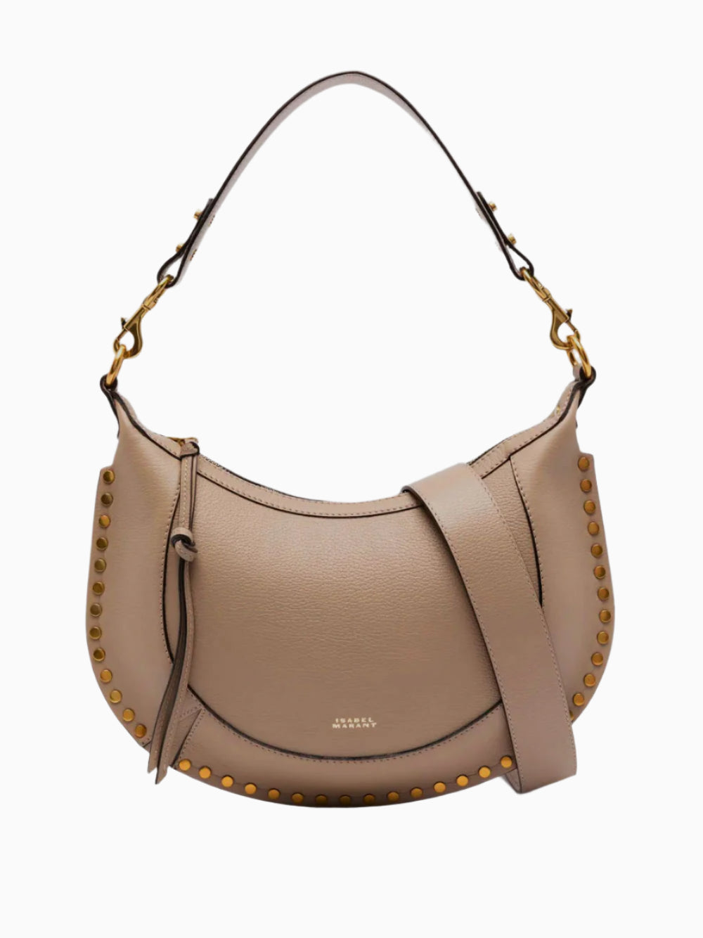 Isabel Marant Naoko bag. Crafted in smooth leather with two removable shoulder straps, one of which is adjustable, and cotton lining on the inside with a patch pocket. Featuring top zip closure, embossed logo on the front and outer edge adorned with Gold tone metal studs.