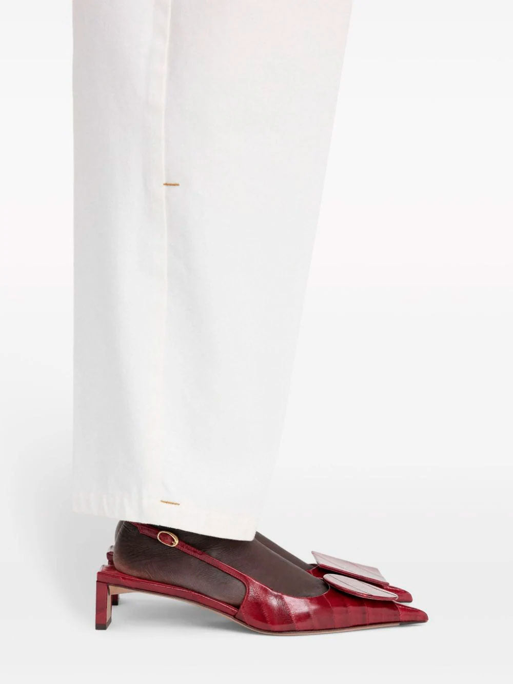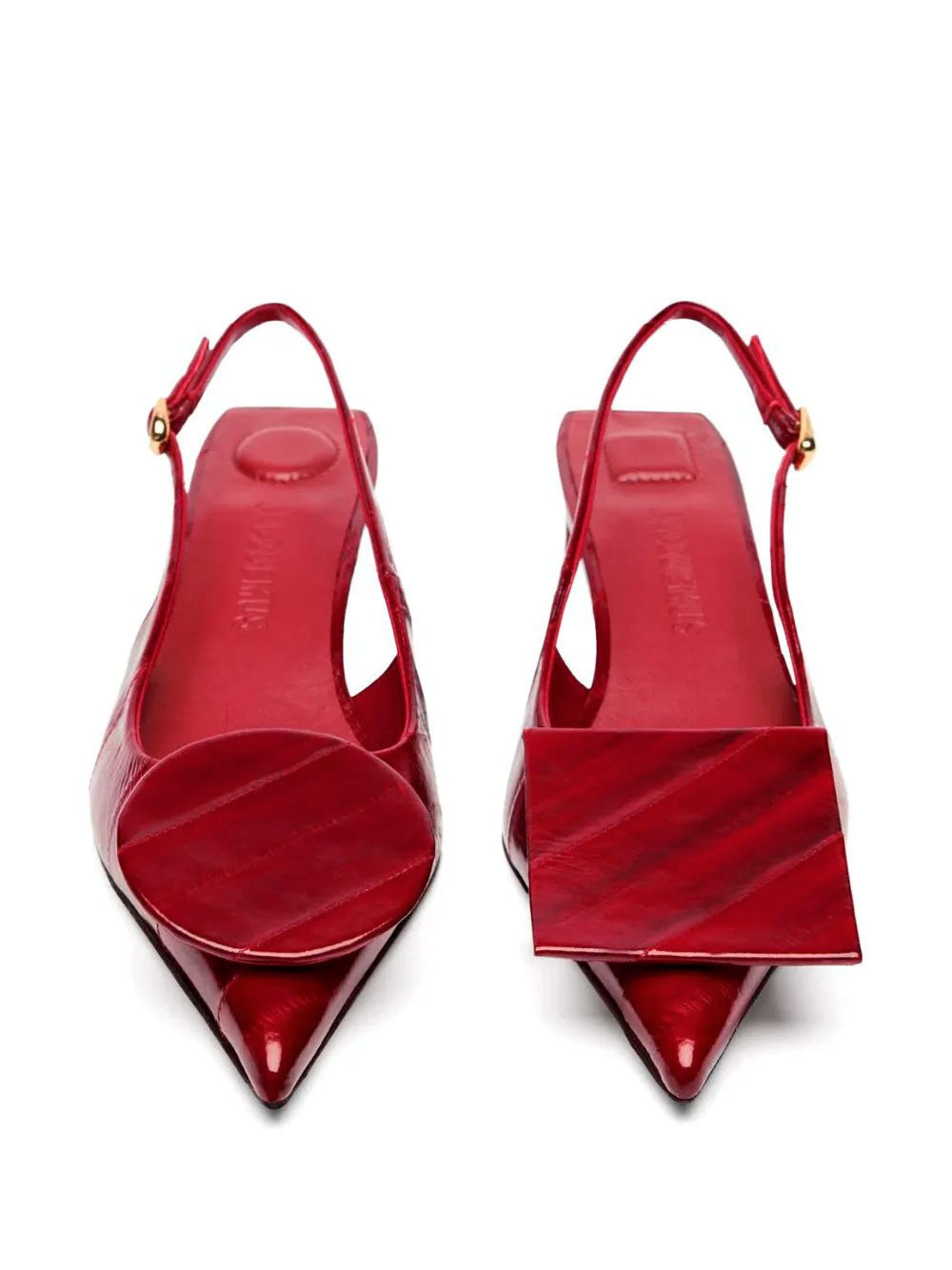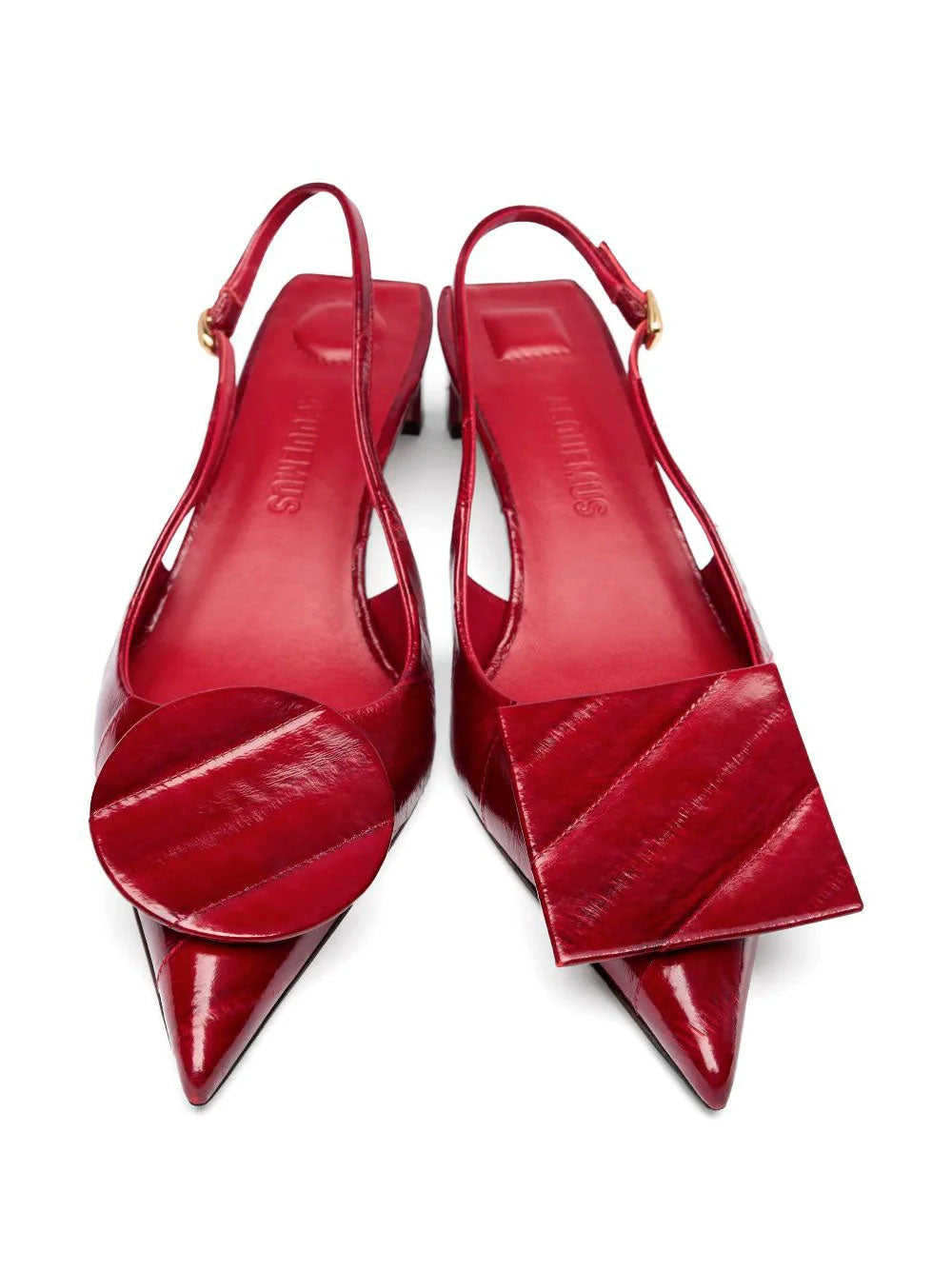 Jacquemus Duelo pumps featuring cherry red, leather, patent finish, circle motif, square motif, pointed toe, buckle-fastening slingback strap, branded leather insole, low sculpted heel, leather sole.