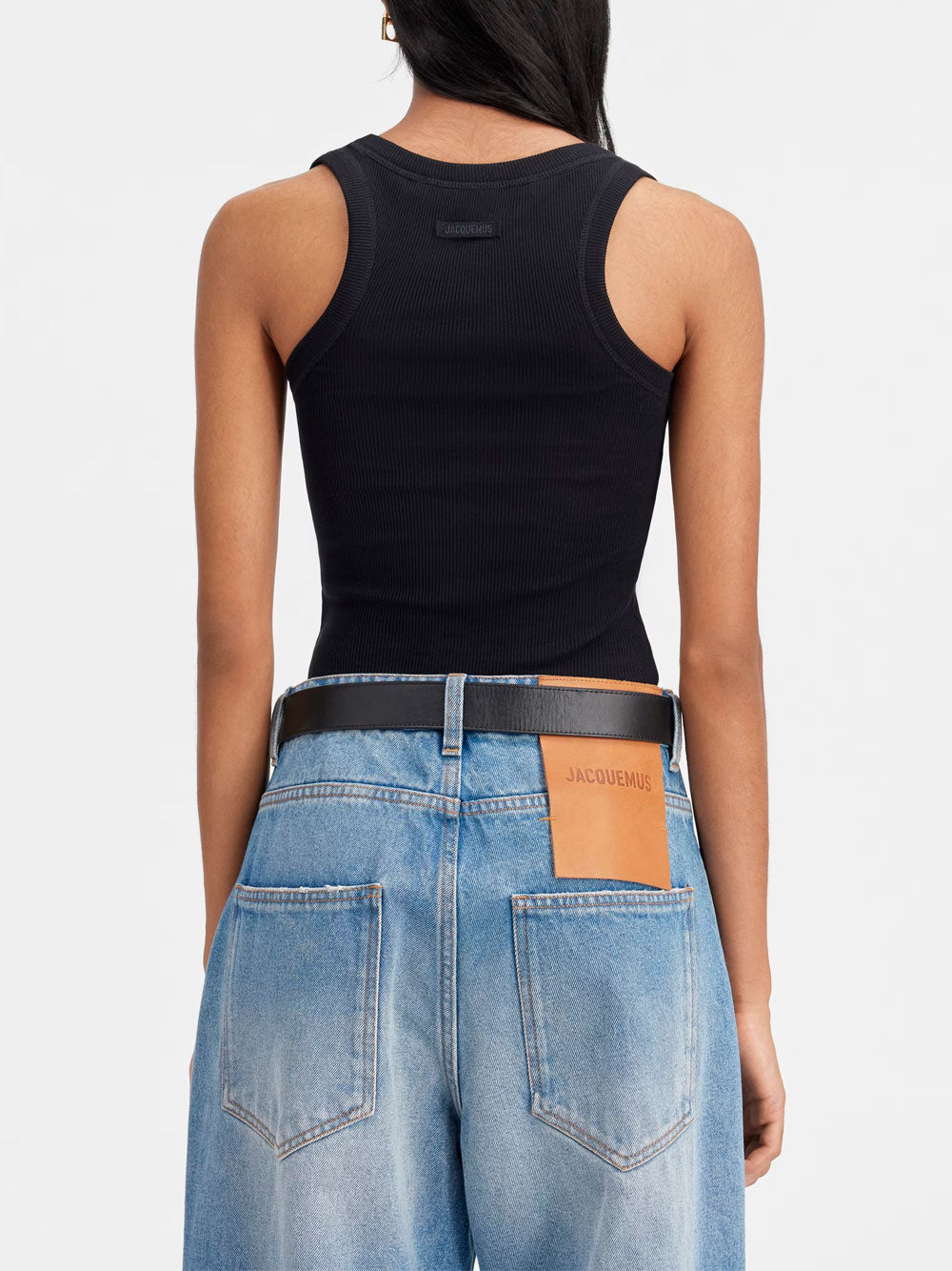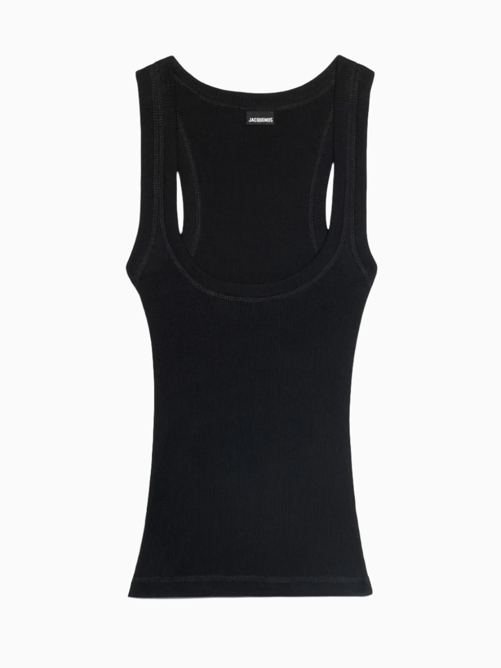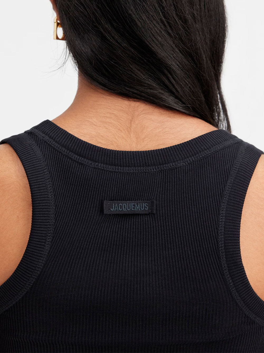 Jacquemus´s Le débardeur Gros Grain. Second skin tank top, fitted shape, crafted in a black jersey rib. Featuring ribbed collar and armholes, a square neckline and embroidered grosgrain logo on the back.