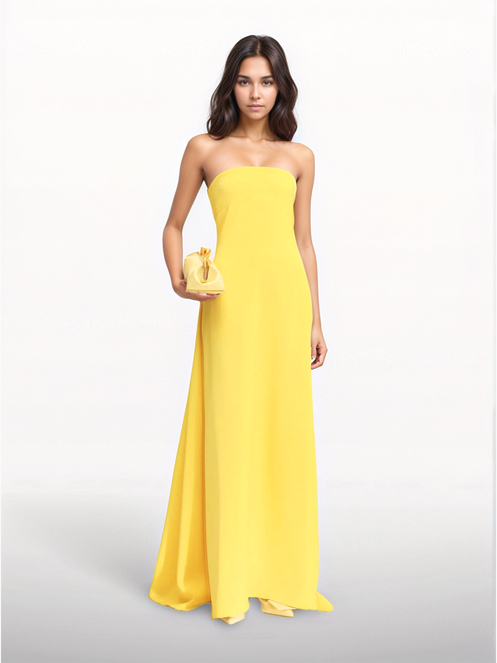 Jacquemus strapless dress crafted yellow. Featuring concealed side zip fastening, sash detail, train and floor-length.