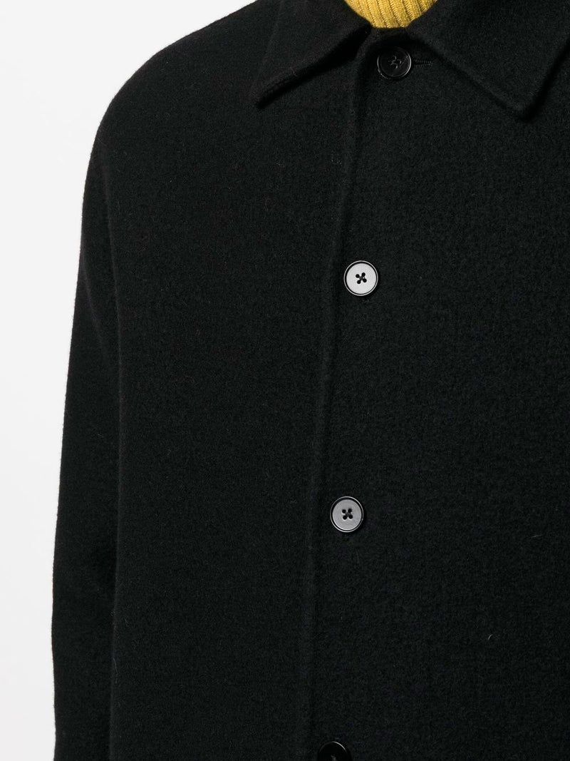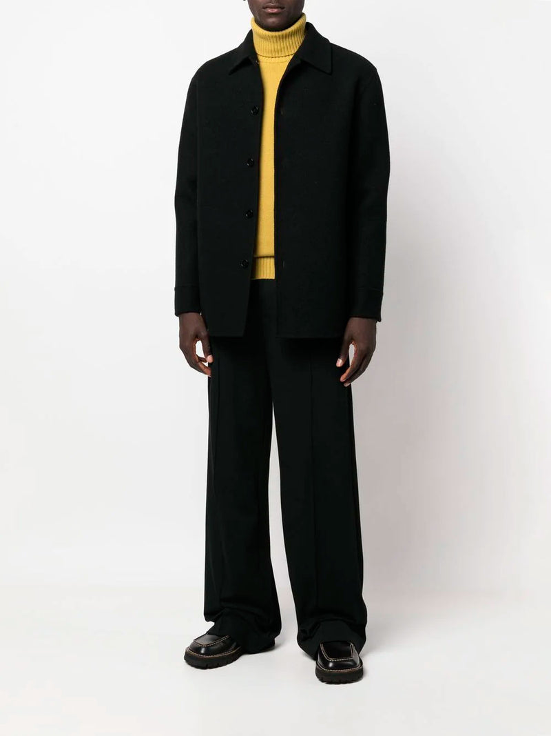 Overshirt from Jil Sander in black virgin wool with silk lining. The jacket features front button fastening, classic collar, long sleeves, buttoned cuffs and curved hem.