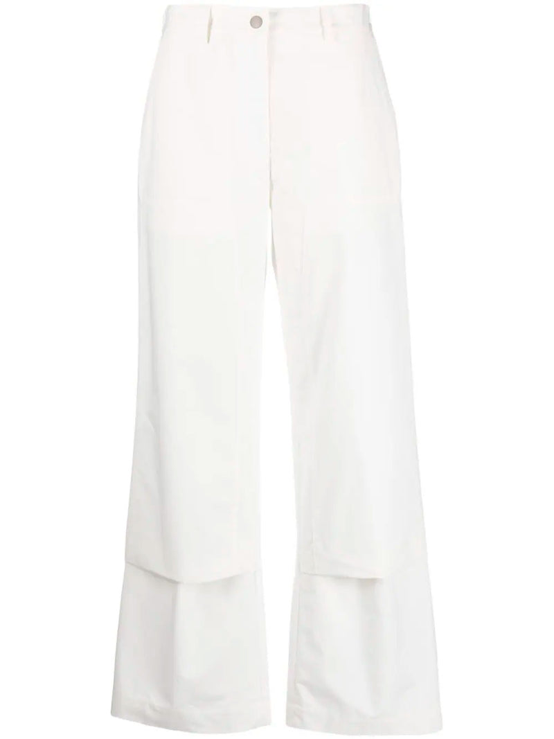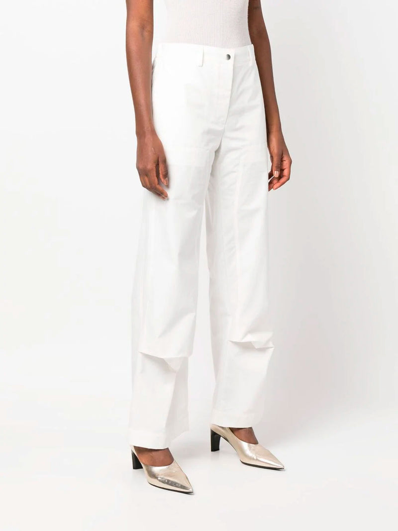 Jil Sander white high-waisted trousers in cotton with logo patch to the rear and layered effect. This sporty design features belt loops, front button and zip fastening and elasticated waistband. The wide leg trousers present three pockets: two side slit pockets and one rear patch pocket.