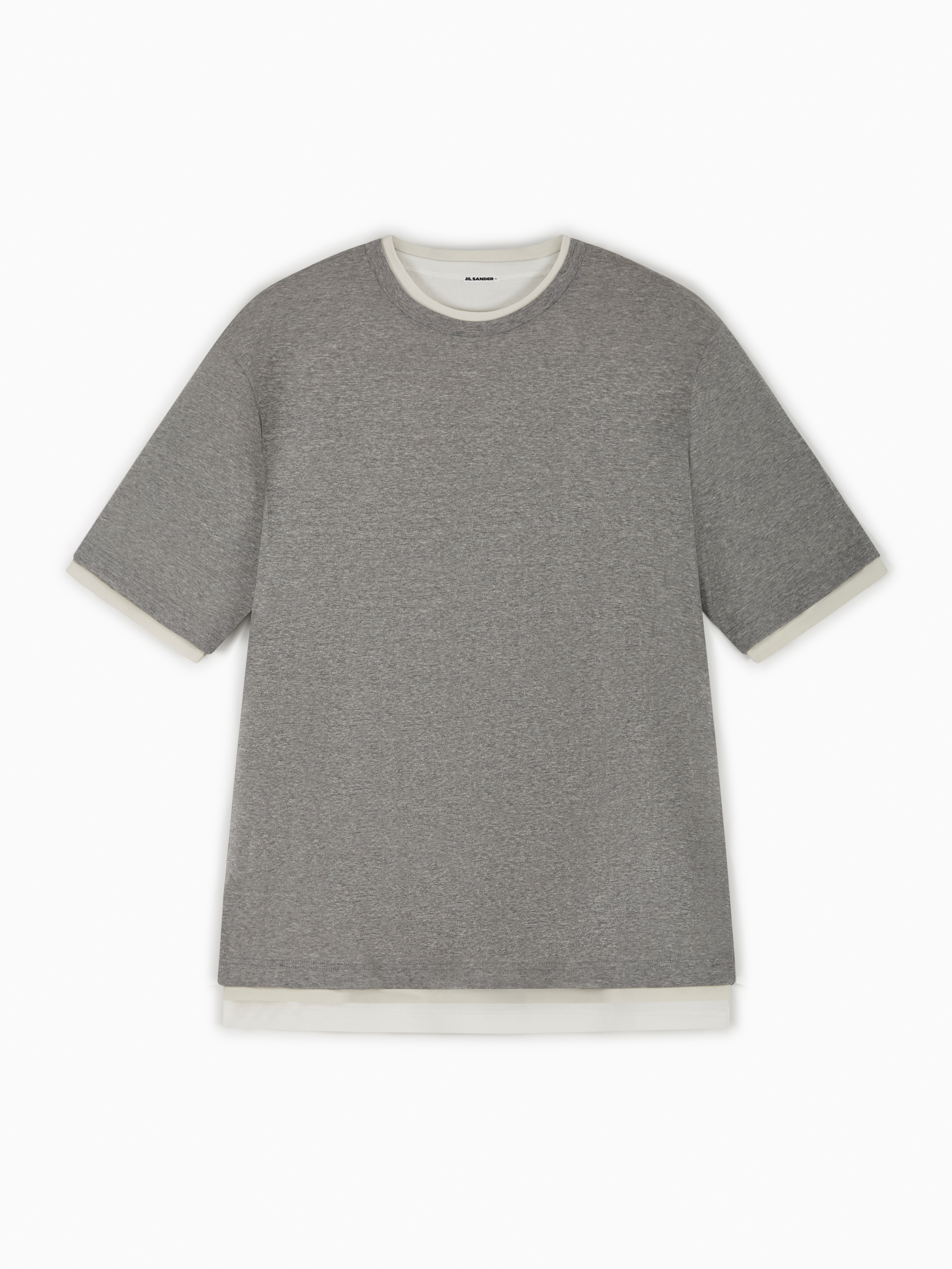 Jil Sander layered t-shirts. Crafted in melange cotton, this kit includes a white sleeveless tank top, a cream oversized t-shirt and a grey t-shirt. Featuring a round neckline, short sleeves, straight hem and a regular fit.