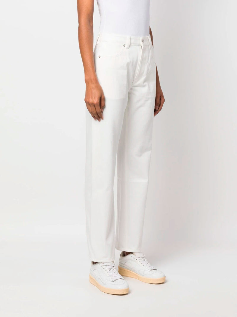 Jill Sander white, cotton jeans featuring front button and zip fastening, belt loops, classic five pockets, mid-rise and straight leg.