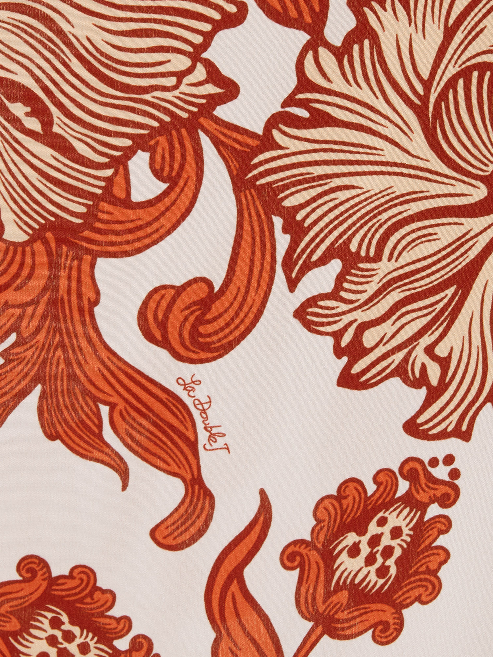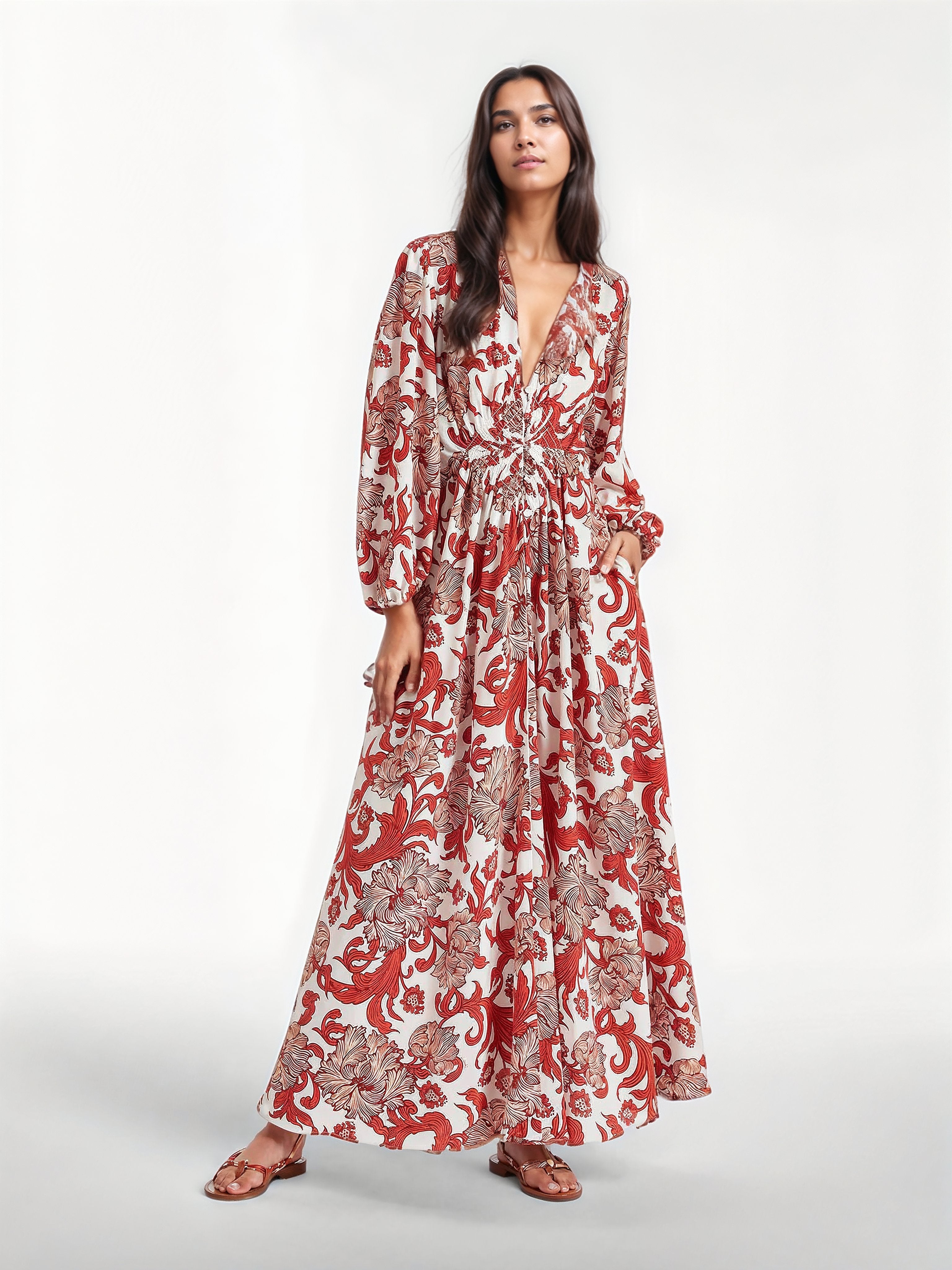 La Double J Long Camerino dress. Crafted in red, white and beige silk with elasticated smocking below the chest and accross the waist. Featuring buttons that run all up the front of the dress, ankle-length, voluminous sleeves, an elasticated cuff and pockets.