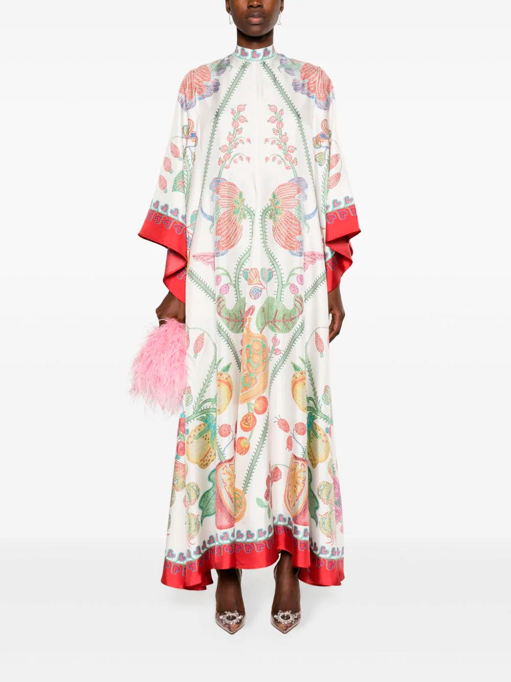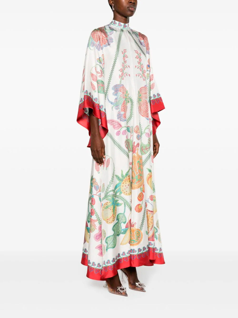 Magnífico Flower Placée-print dress, crafted in white/multicolour silk. Featuring shift style, floral print and mock neck. Rear tie fastening, long draped sleeves and maxi.
