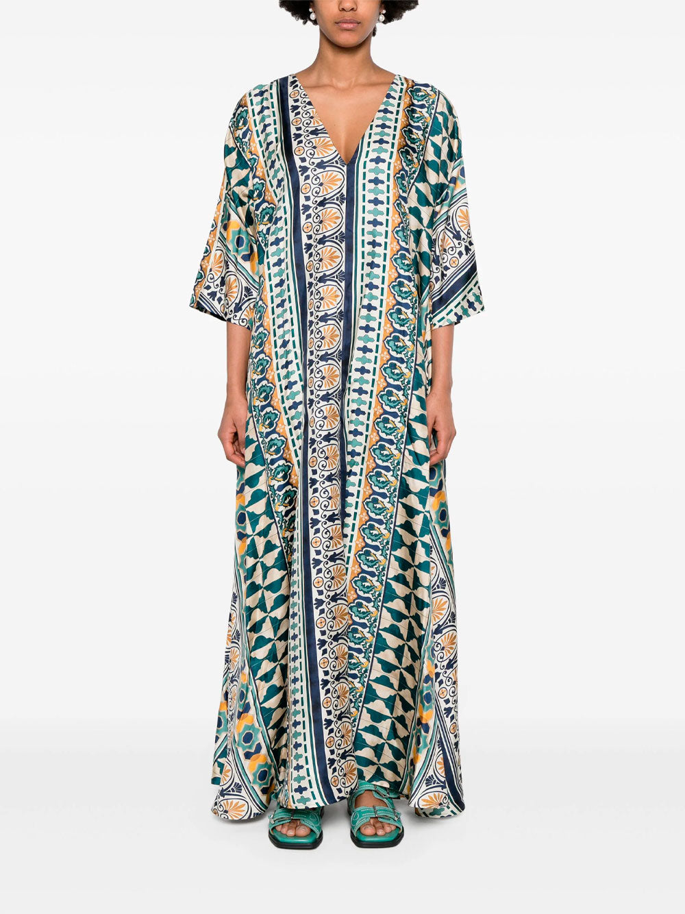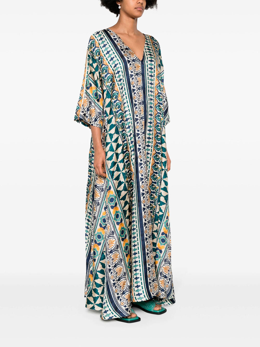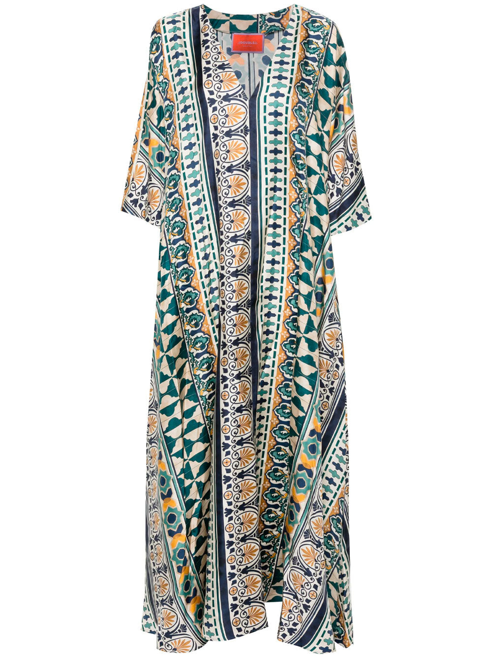 La DoubleJ Muumuu geometric silk dress. Featuring blue/yellow/beige, twill weave, geometric-pattern print, V-neck, half-length sleeves, two side inset pockets, internal logo tag, long length, flared hem.