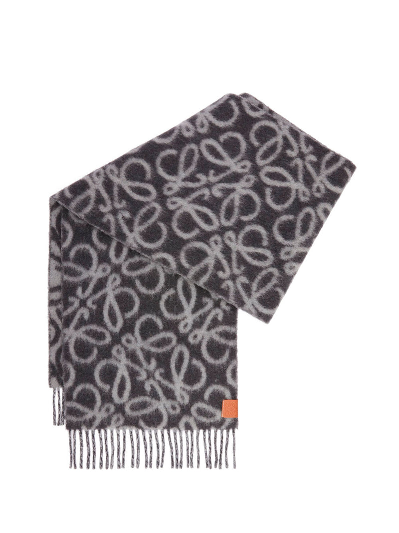 Loewe´s Anagram scarf in alpaca and double-faced wool, in black. With the anagram in light grey printed all over the garment. Fringed edges. Leather label engraved with the anagram on the corner.