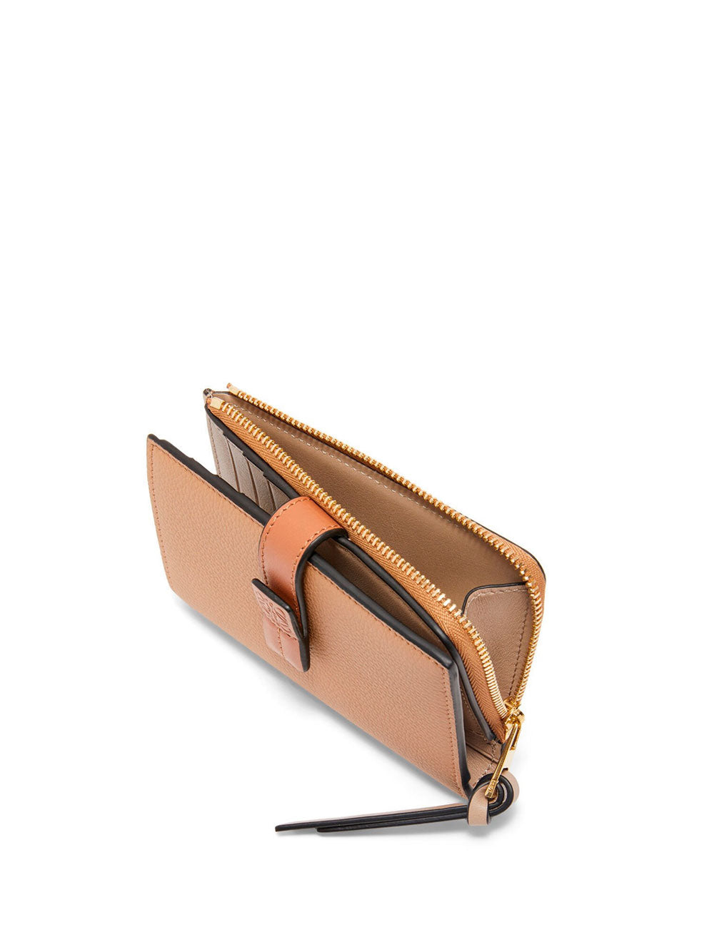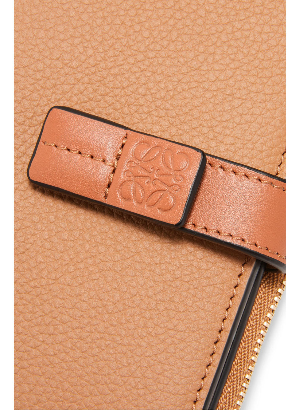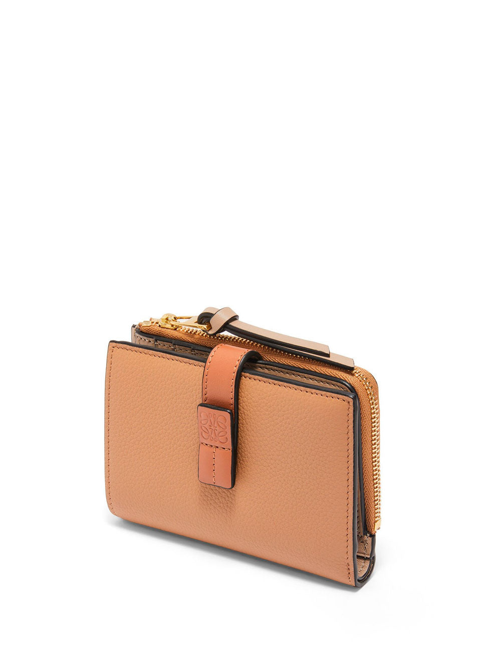 Loewe compact wallet. Crafted in tan soft grained leather with six card slots, four small pockets and one large pocket for notes. Featuring one coin compartment, leather zip pull and a snap button closure. Leather lining and embossed Anagram.