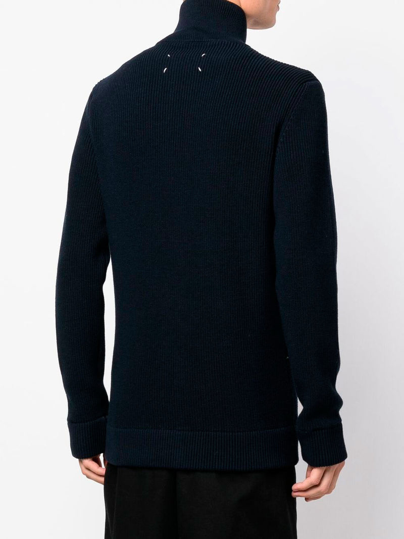 Maison Margiela navy blue cotton-wool blend cardigan. Featuring ribbed-knit, front two-way zip fastening, high neck and long sleeves.