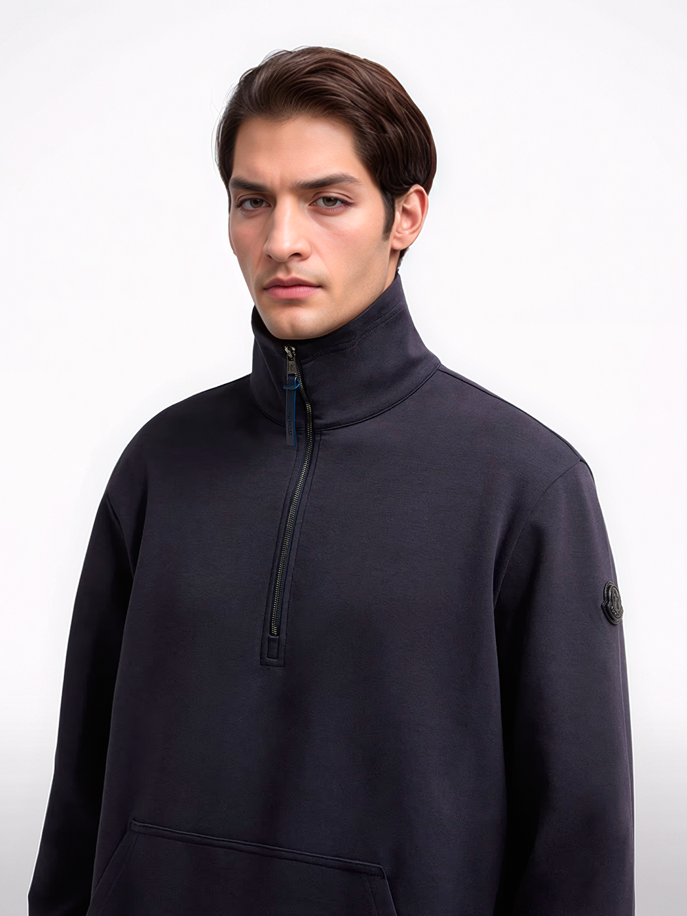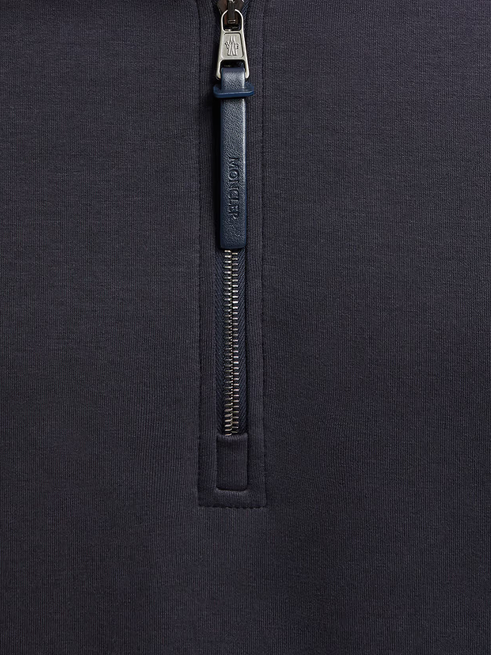 Moncler half-zip sweatshirt. Crafted in navy blue cotton blend interlock with zip closure, kangaroo pockets with knit trim and logo patch in synthetic material.