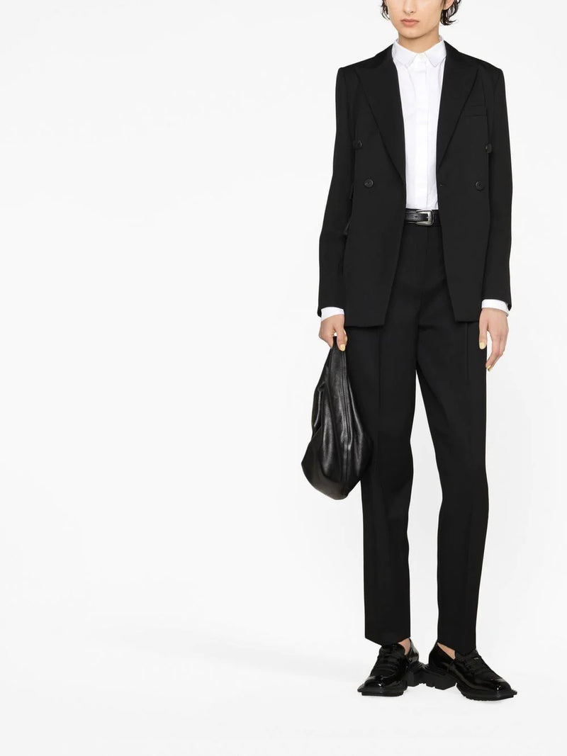 Partow pleated tailored-cut trousers. Featuring black, virgin wool, pleat detailin, belt loops, hook and zip fly fastening, two side inset pockets, two rear jetted pockets, high-waisted, tailored cut.