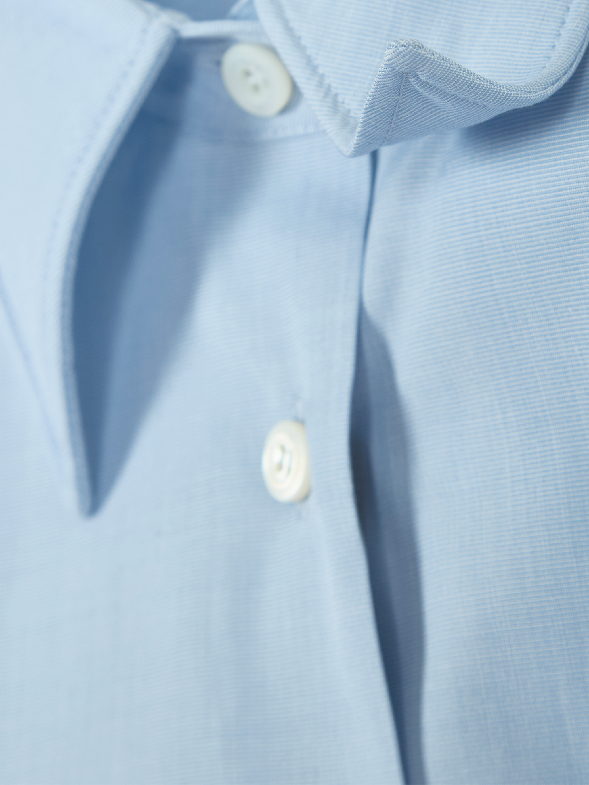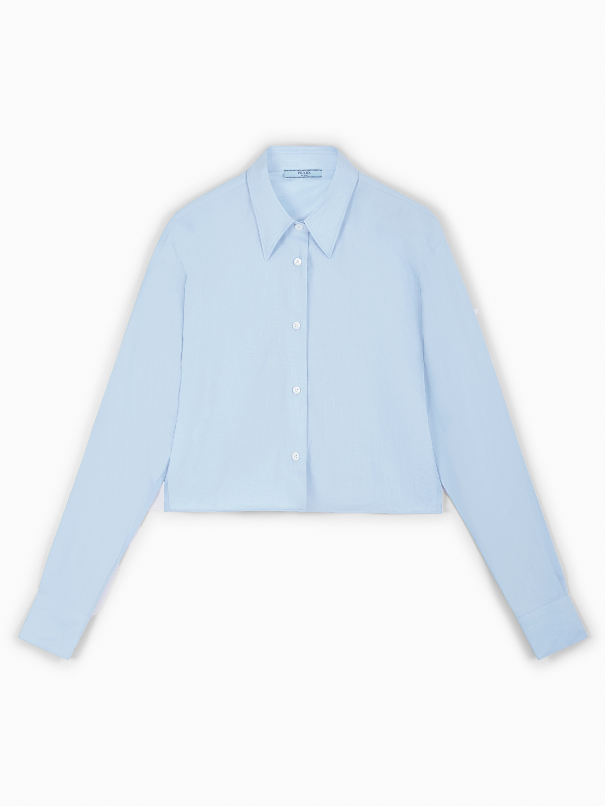 Prada Fil-à-Fil shirt. Crafted in light blue cotton with a triangle logo patch on the back neck, classic collar and front button closure. Featuring long sleeves with buttoned cuffs, a rounded hem, shapeable wire thread inserted on the collar, cuffs and hem.