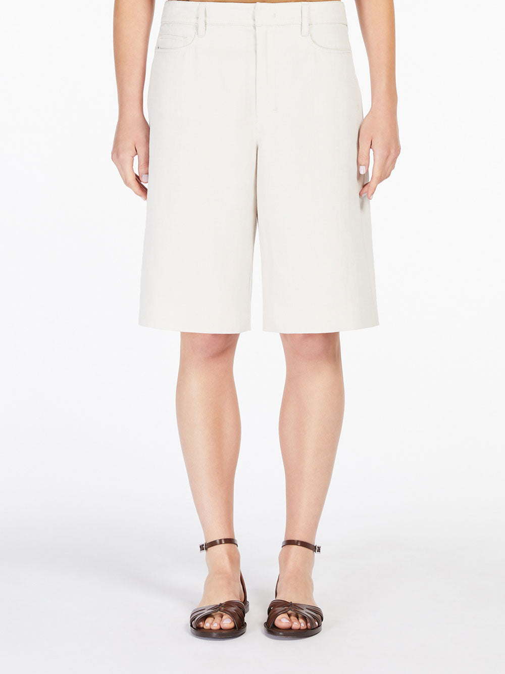 'S Max Mara Cotton and linen twill Bermuda shorts. The straight-fit 5-pocket model boasts welt rear pockets, belt loop detail and an embroidered branded rear hem tag. High-cut waistband, and a fly-covered zip and hook-and-bar fastening.