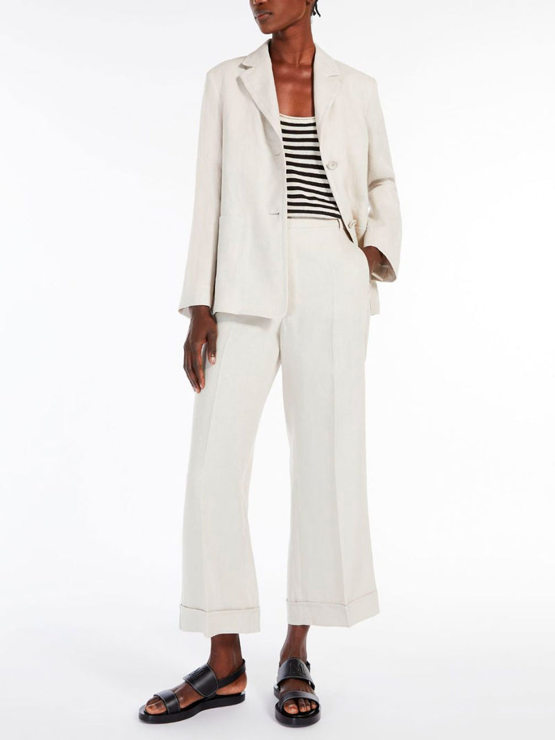 ‘S MAX MARA palazzo trousers in ecru, pure linen canvas fabric featuring in-seam side pockets and belt loop detail at the waist. Pressed pleat detail-embellished wide leg with a turned-up hem. Fly-covered zip and a small hook-and-bar fastening.