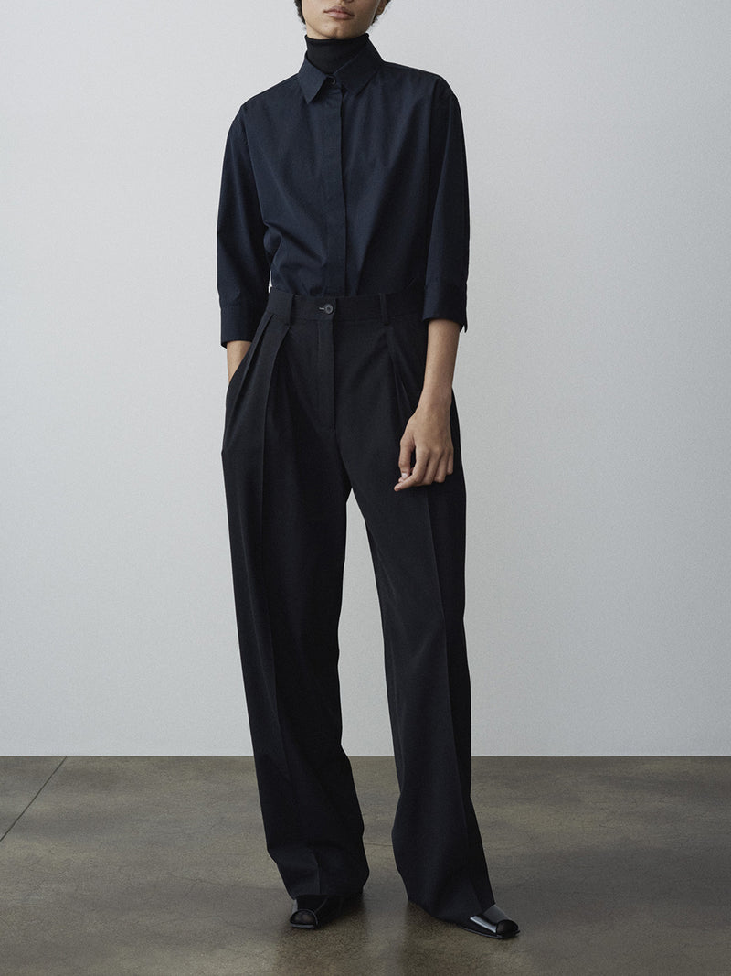 THE ROW low-rise pants in lightweight viscose and wool with a loose, flowing leg, double dart front, and slant side pockets.