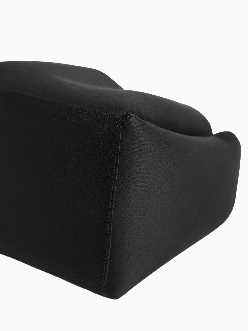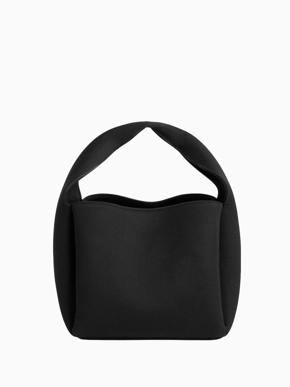 Cubic TOTEME bucket bag reimagined in elegant satin and scaled to petite proportions. It comes with a fine detachable strap for different carrying options and is fitted with an internal clasp and card slots. Use it as a hands-free evening accessory.