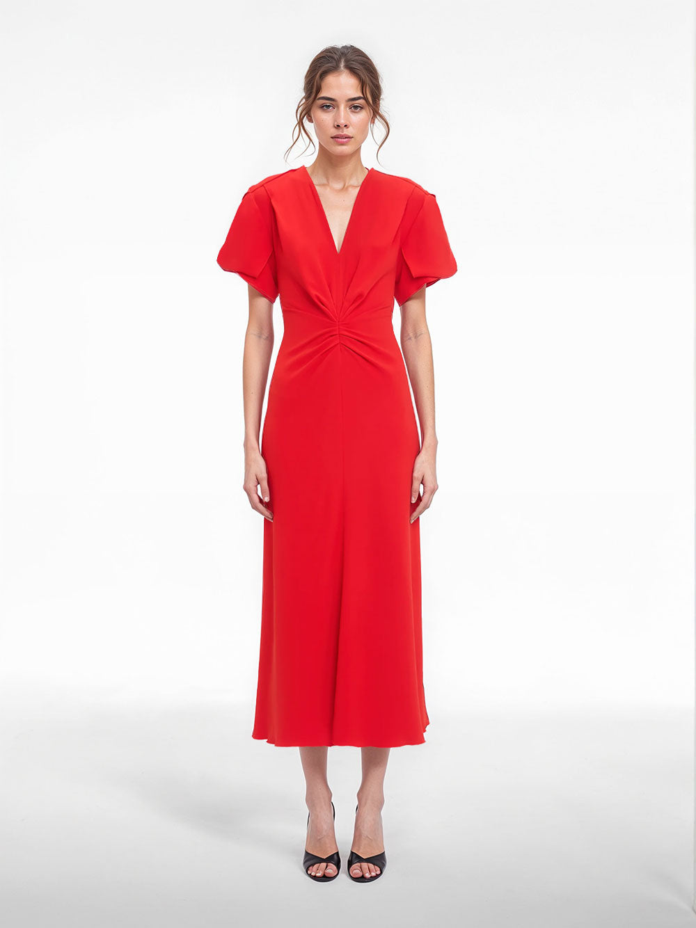 Victoria Beckham gathered V-neck midi dress. Pleat details at the front waist, shoulder pleats, hard press details through the skirt and back shoulder in a Tomato colour. Featuring exposed seams, contrast topstitching and a longer-length hemline at the back.